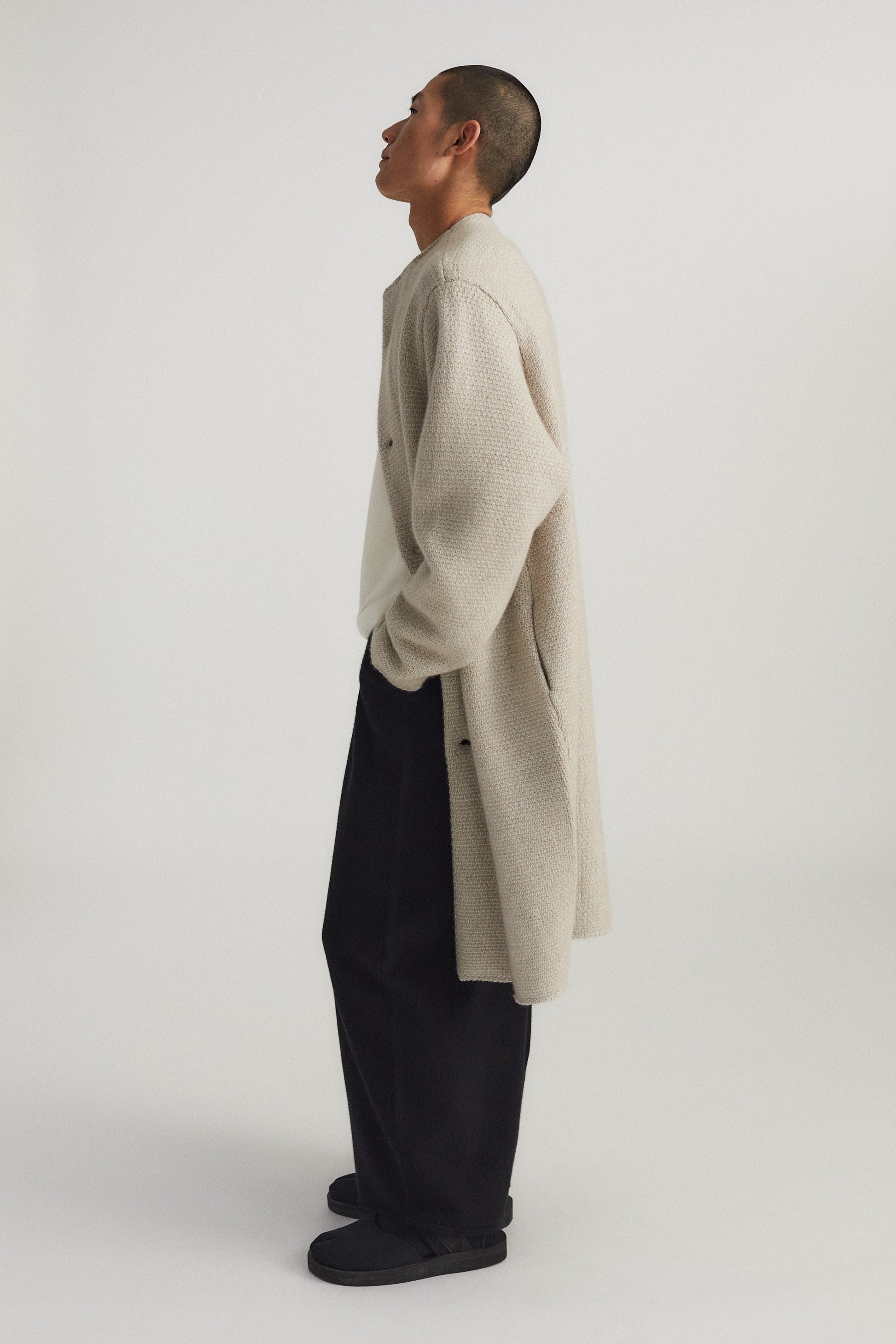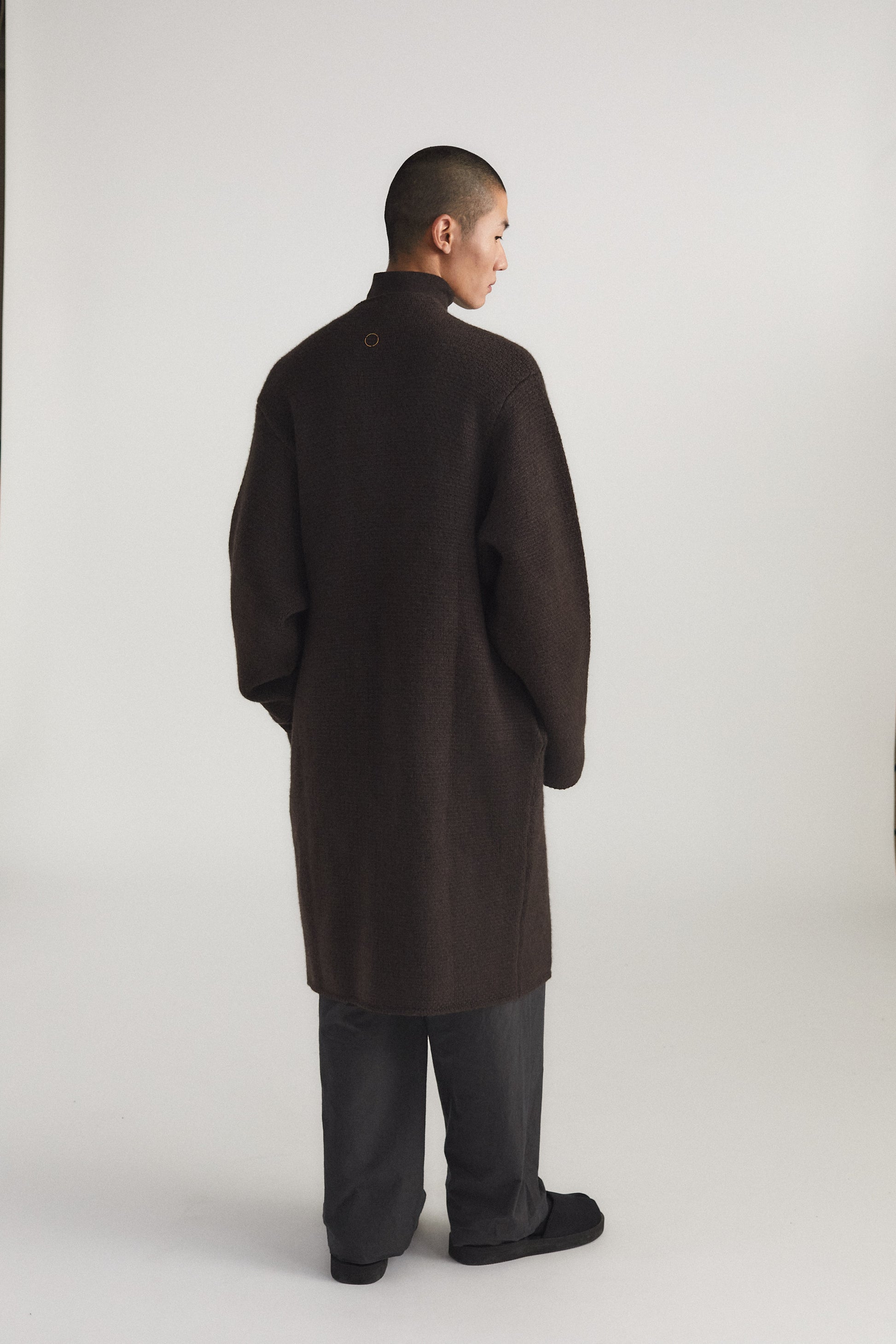 A rich textured chunky knit coat that falls just below the knees. Features dropped shoulders, side seam pockets, and a relaxed silhouette with oversized sleeves.