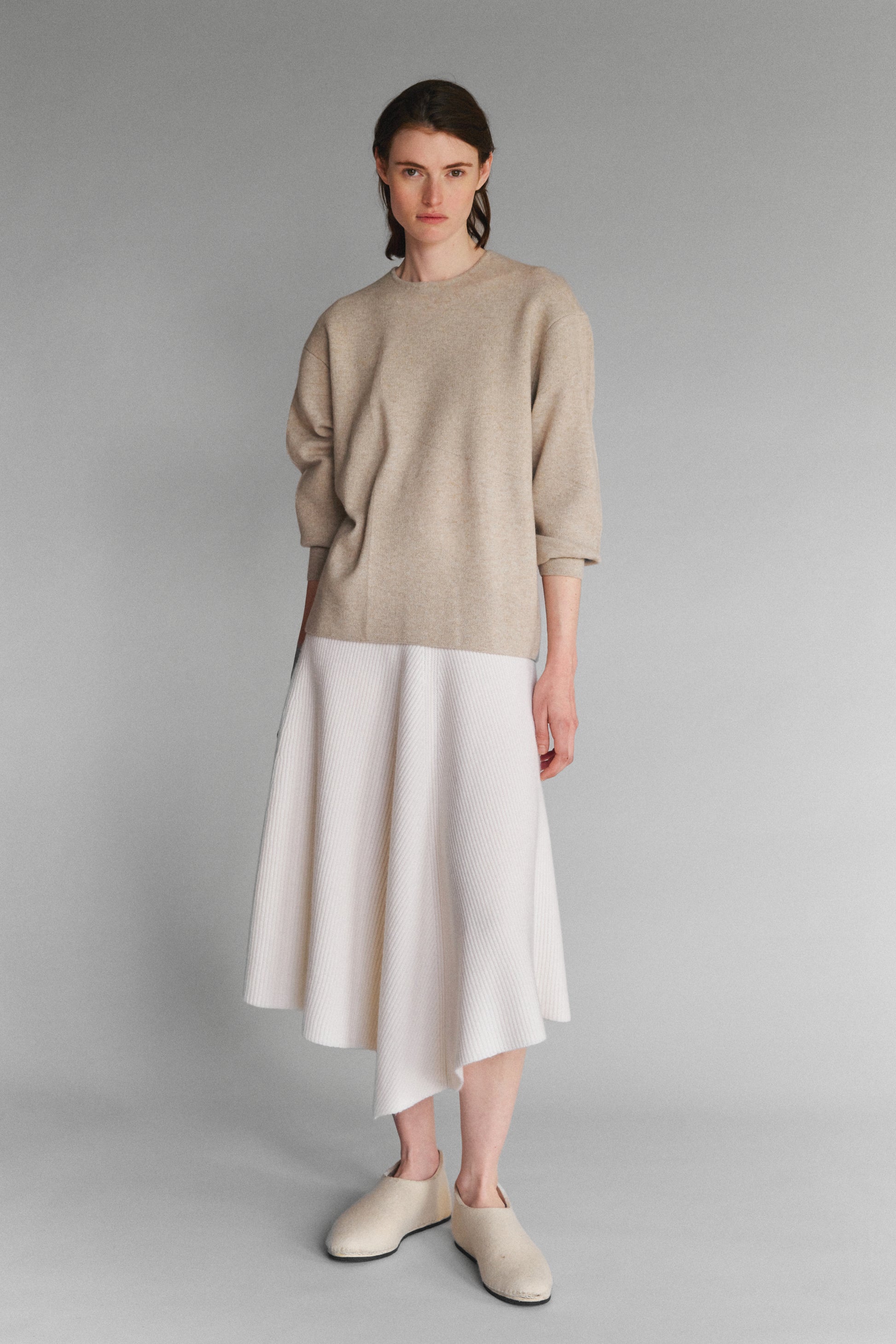 An oversized fit sweater with thin and thick knit formed by an abstracted pattern of our logo letters. Features a boxy silhouette and clean trims for a more elevated version of a sweater that can be dressed up or down.
