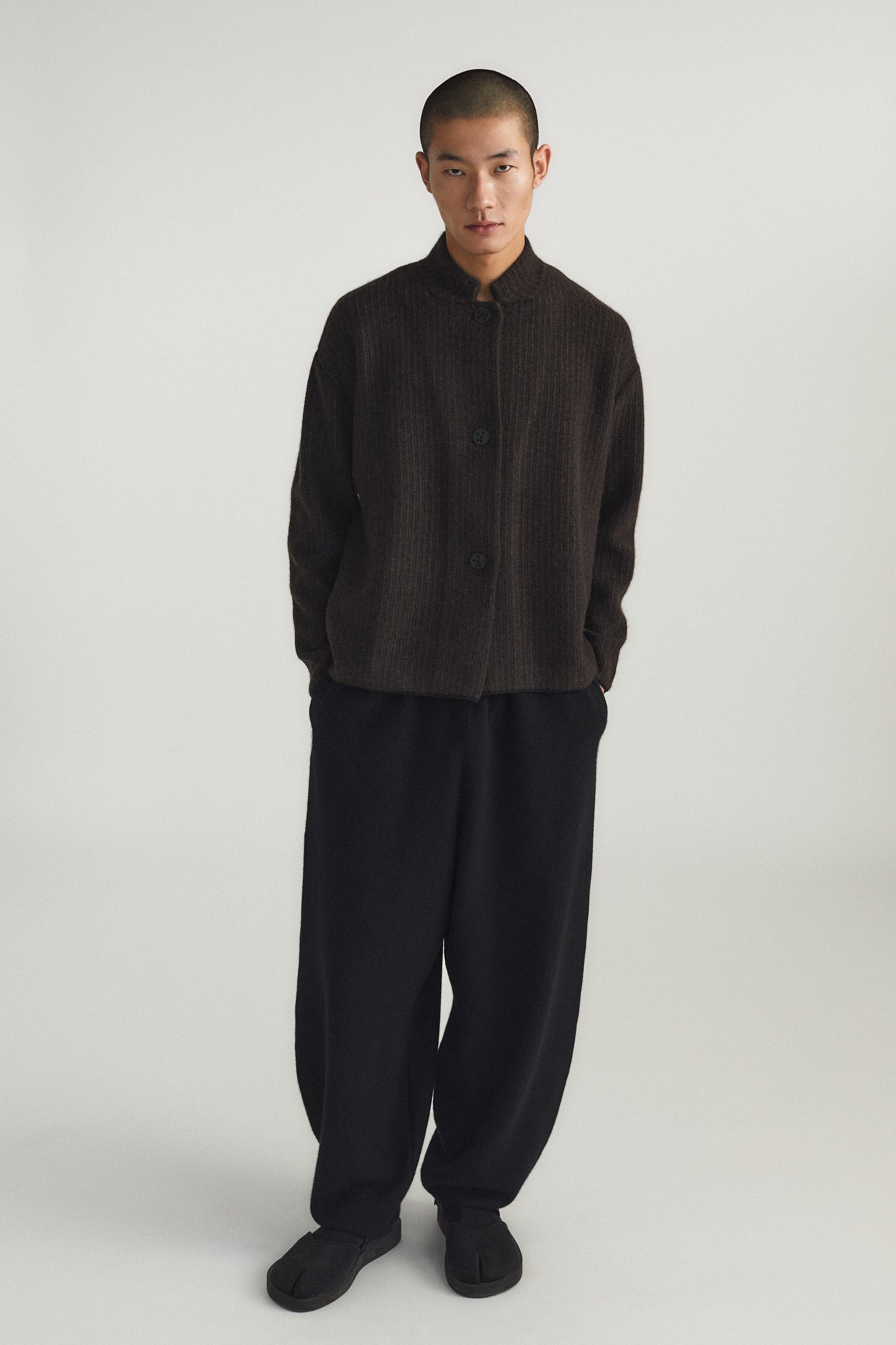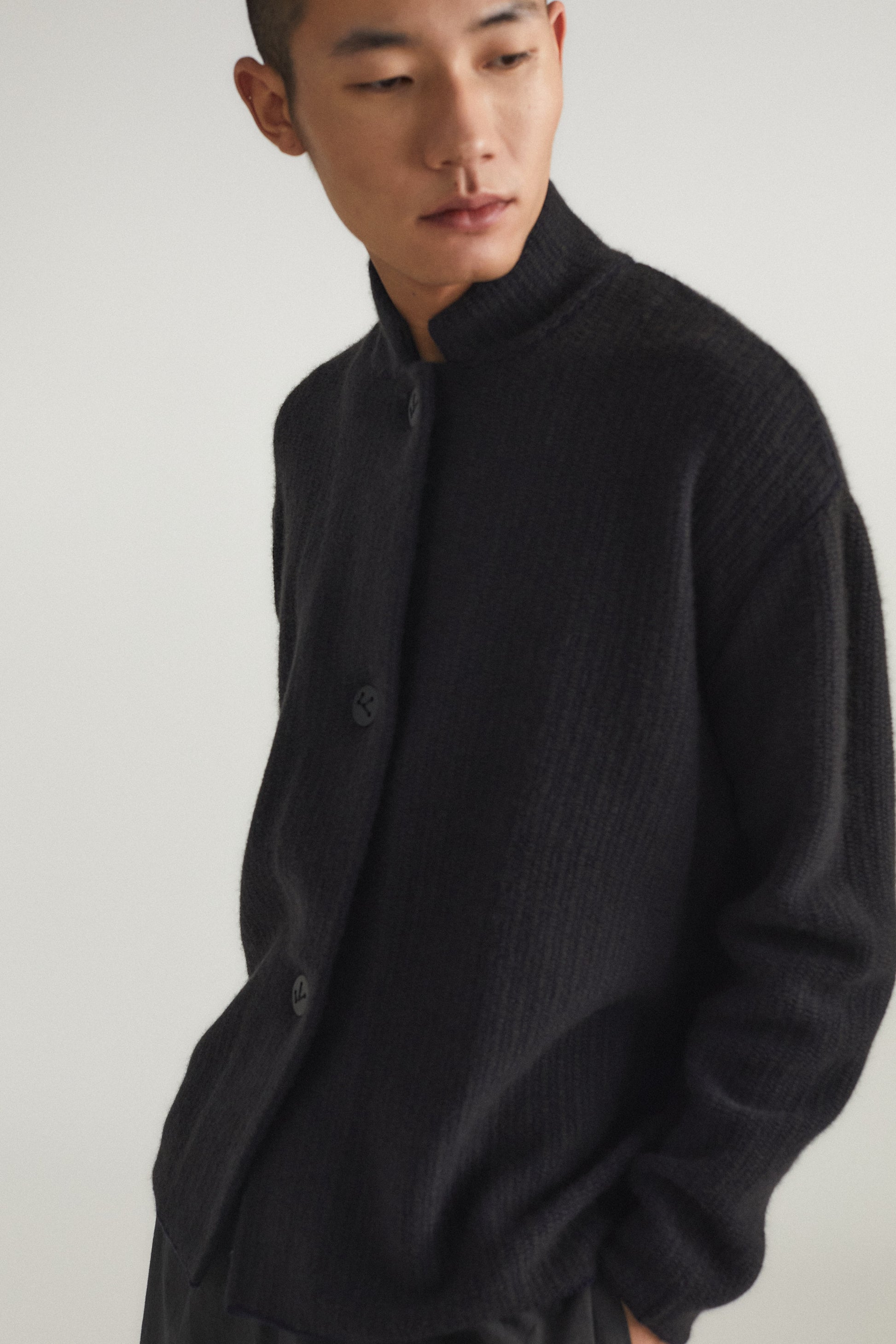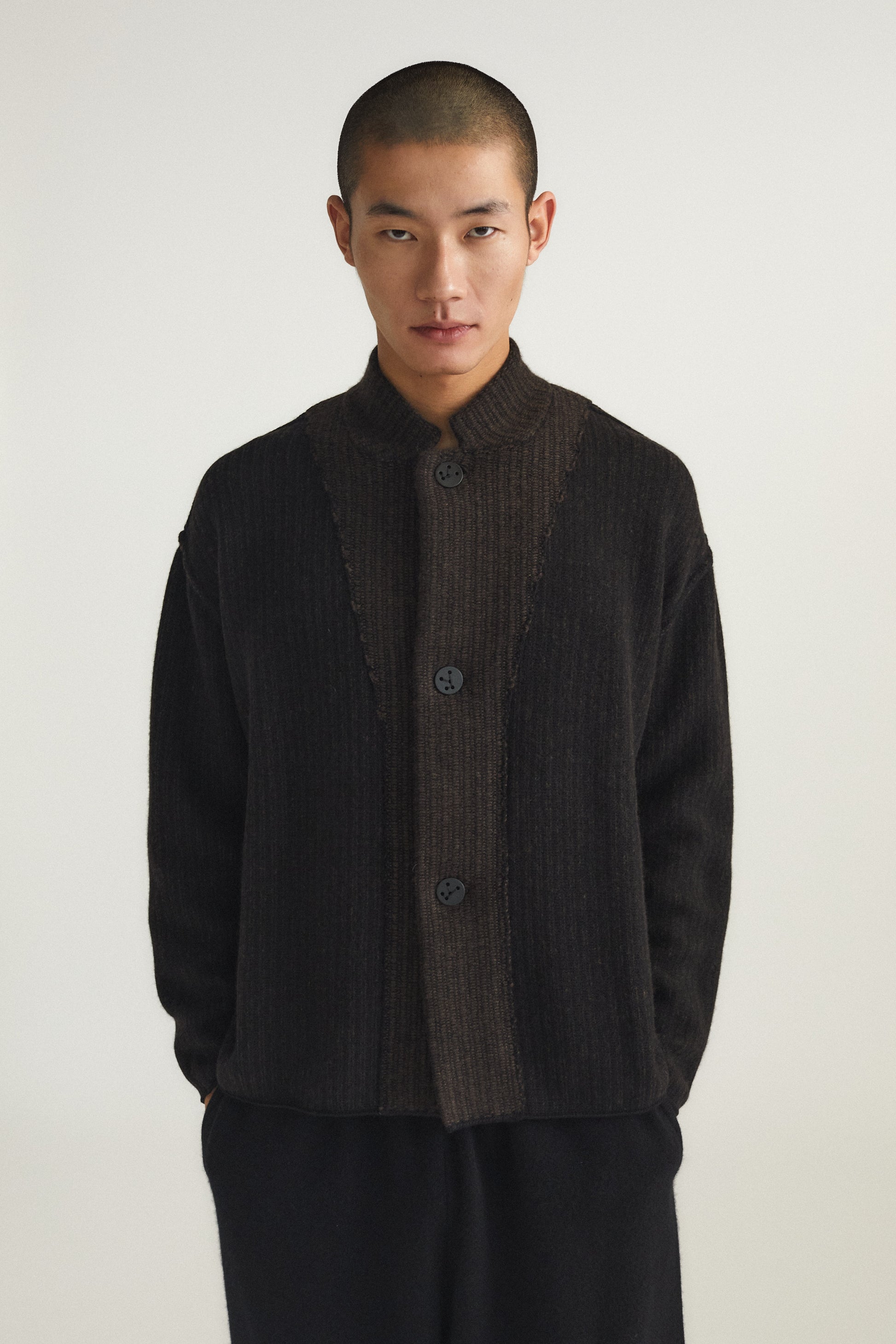 An elegant yet relaxed float knit jacket with subtle texture and a light feel. Fully reversible, one side offers a clean finish while the other, with its visible front placket, adds an artistic element. Features reversible side pockets.