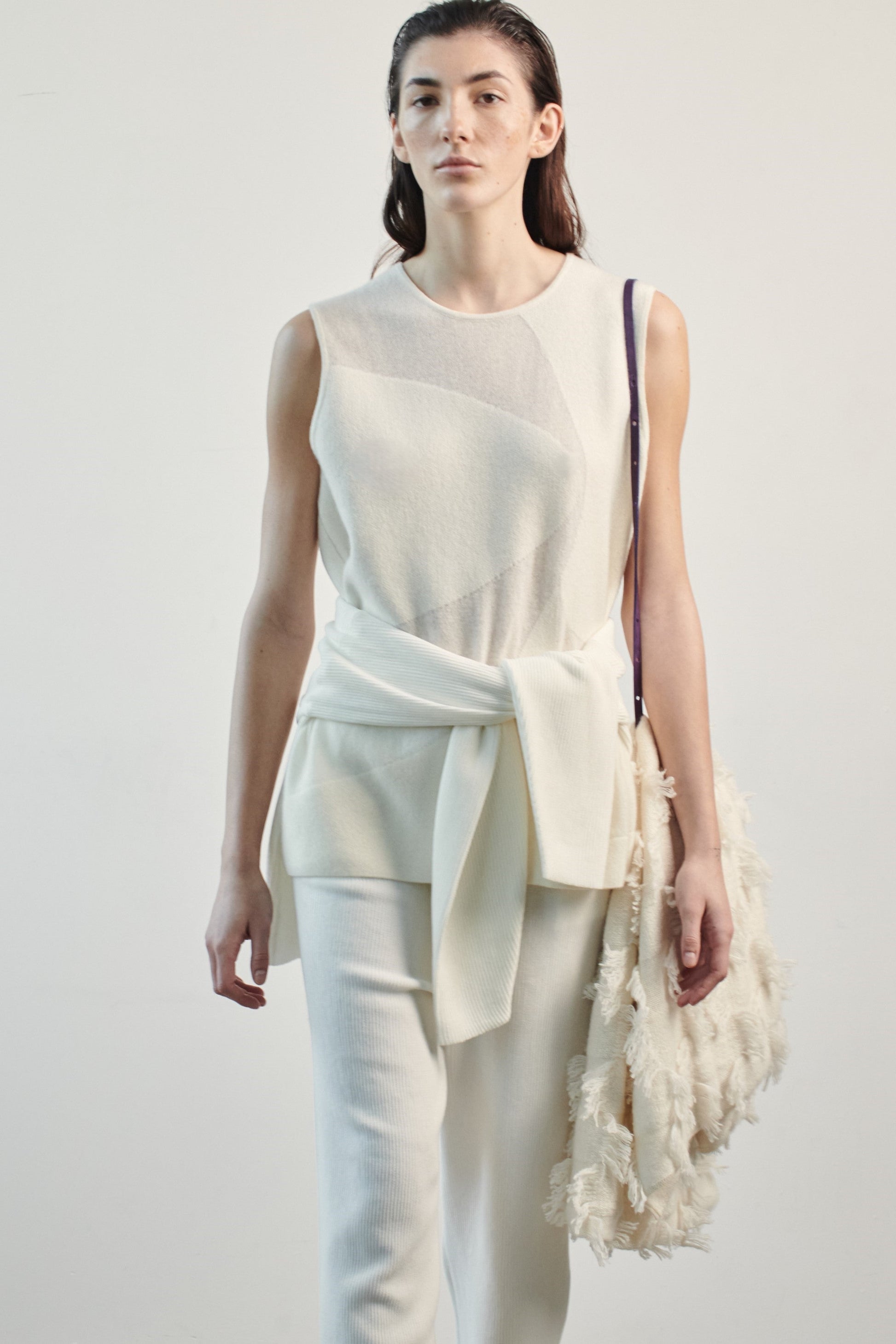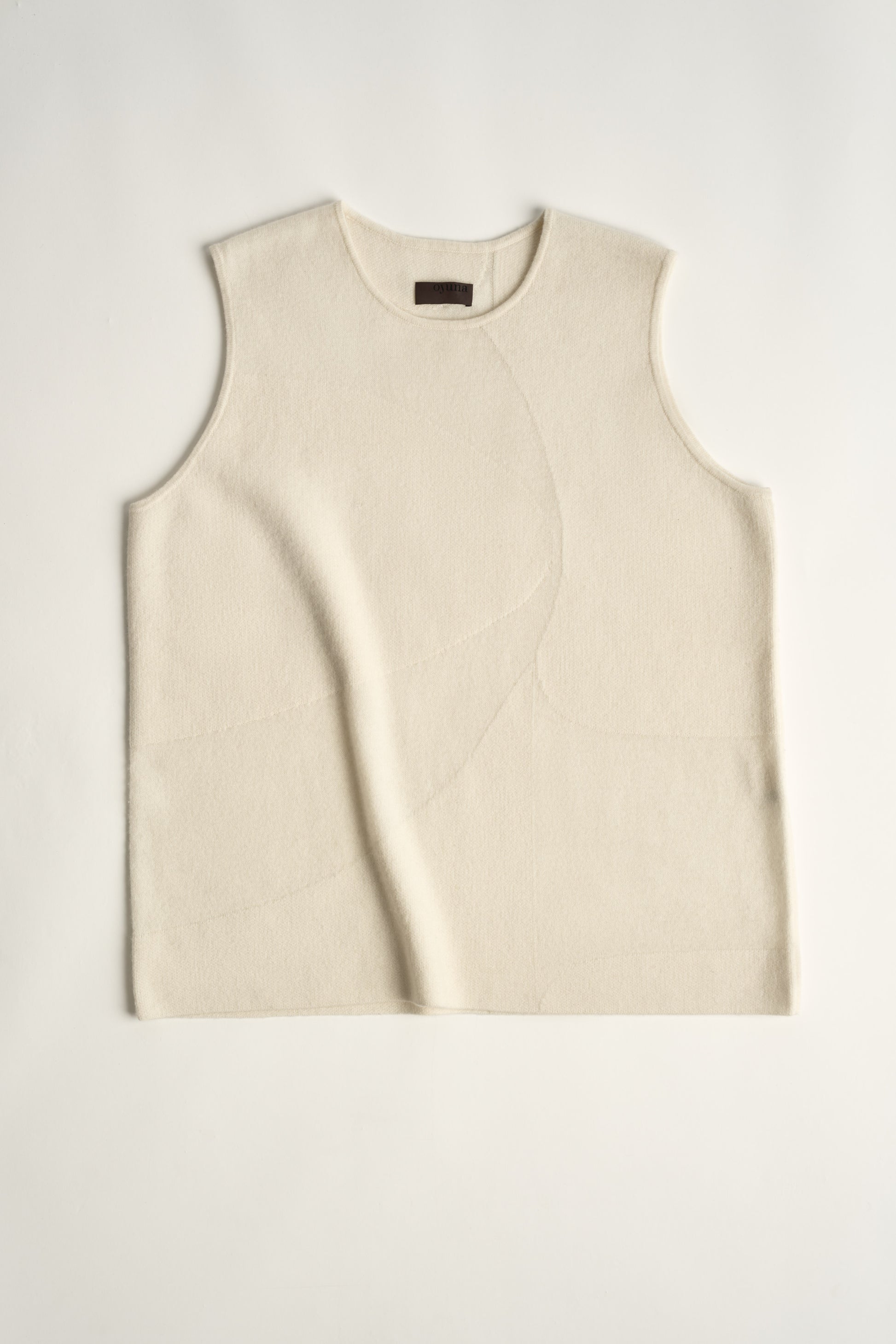 A standout cashmere knit vest with a subtle graphic jacquard print. Its boxy silhouette and fitted shoulder make it the perfect relaxed top to wear on its own or for layering.