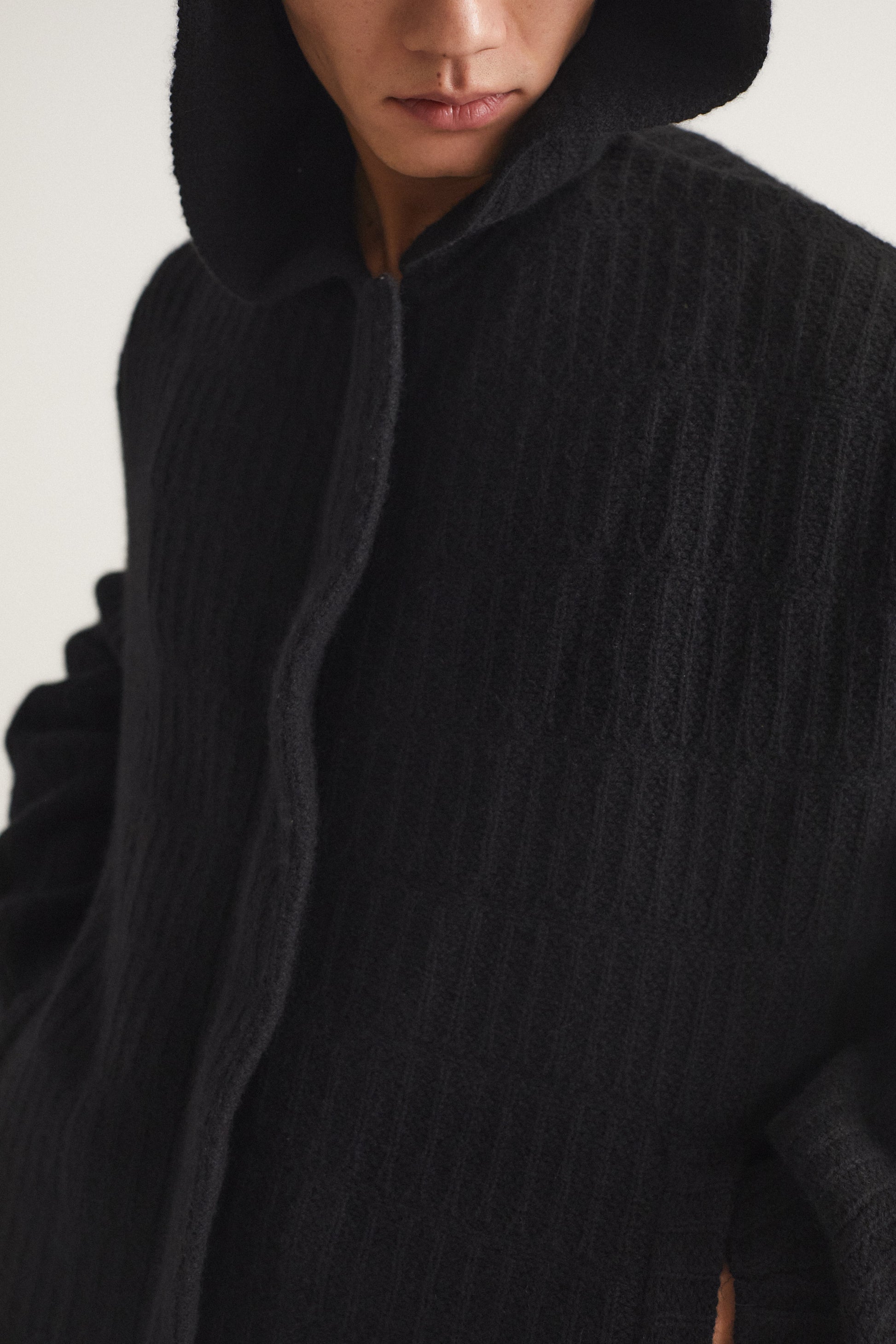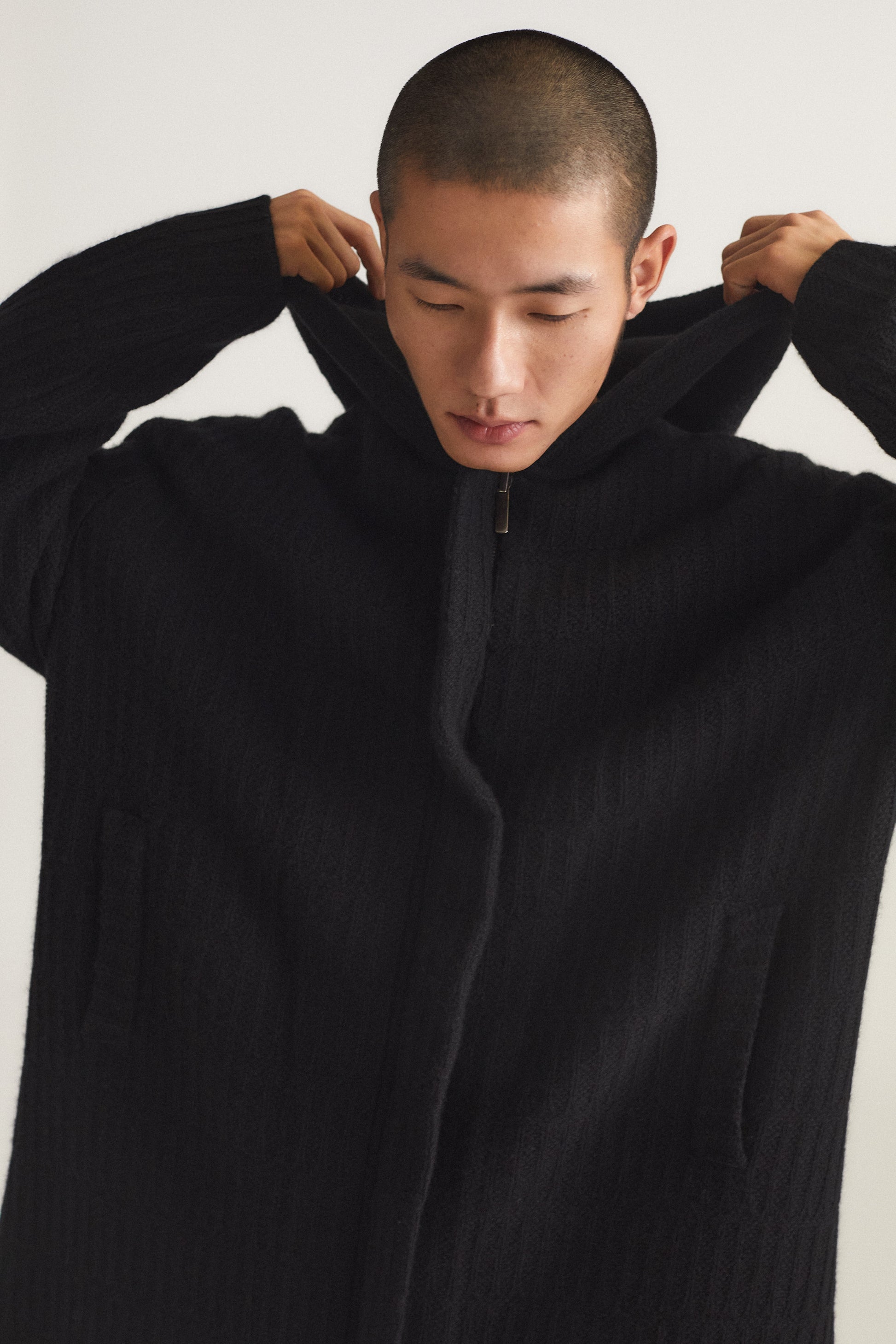 An oversized hooded cashmere coat crafted from a richly textured knit and offering supreme softness. Its relaxed silhouette and generously sized hood create an effortlessly elegant layer for any cold-weather ensemble. Finished with a two-way zip closure and practical side pockets.
