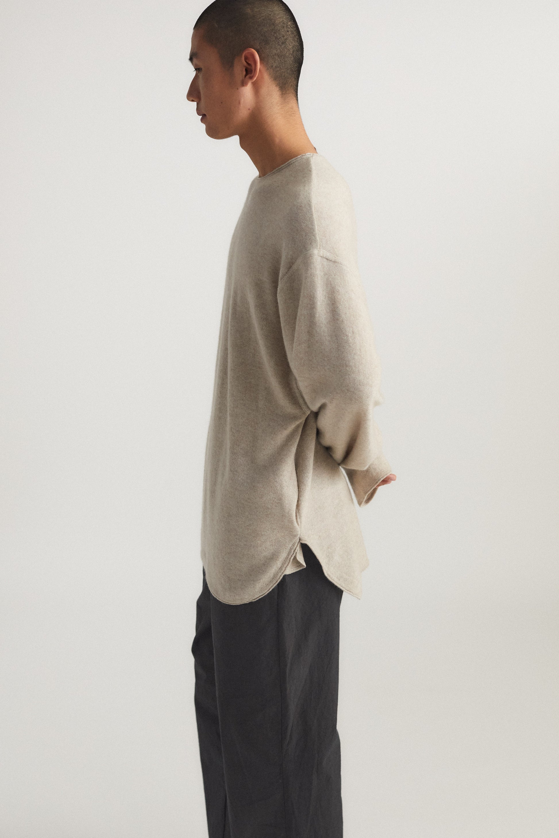 A relaxed, long-fit oversized tunic-style knitted top with a softly shaped round neck and curved hem. Featuring side pockets, it pairs beautifully with skirts or trousers for effortless, versatile styling.
