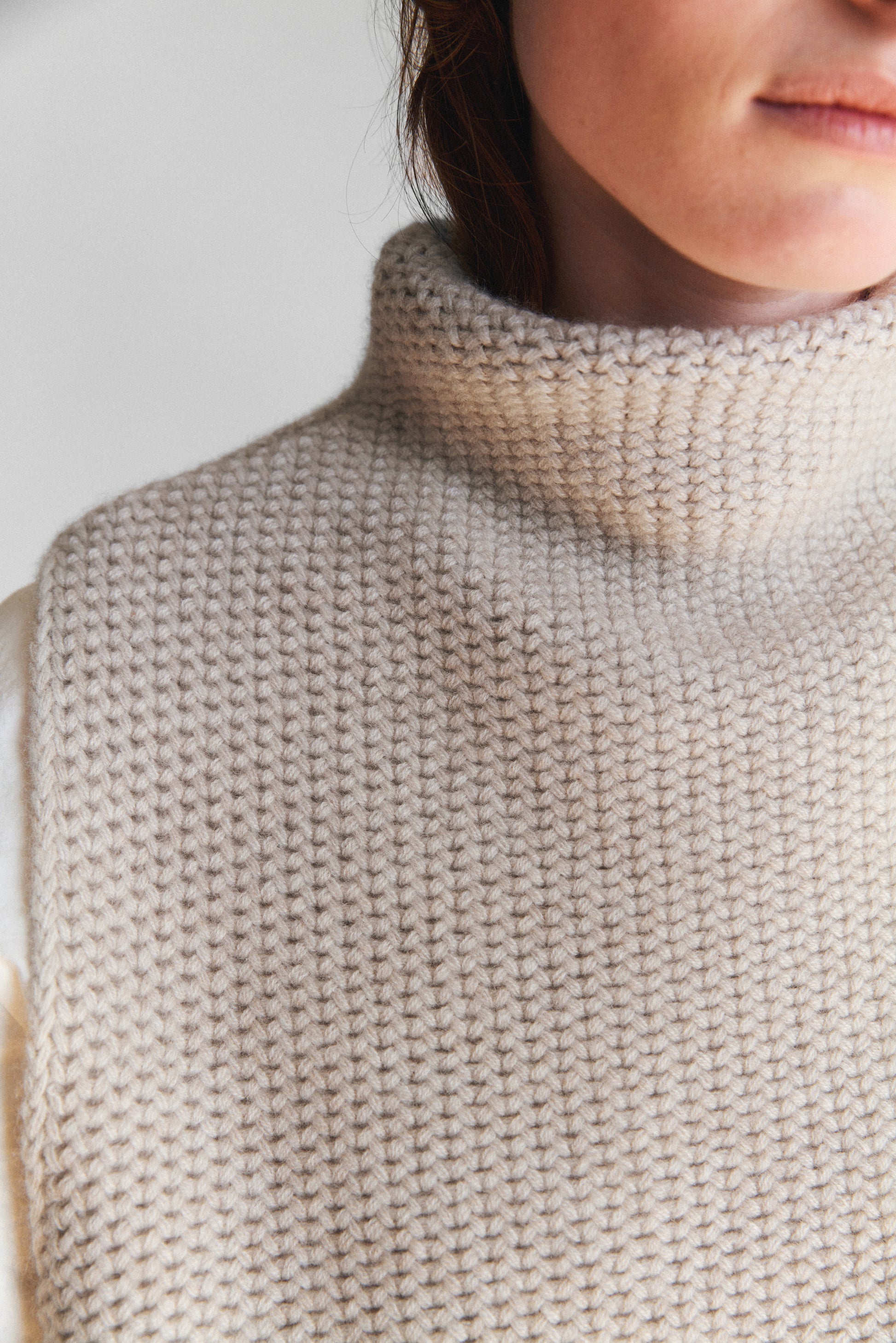 Knitted chunky sleeveless top with rich texture and subtle softness. Perfect for layering, it brings effortless elegance and versatility to any wardrobe. It can be styled over a shirt or vest.