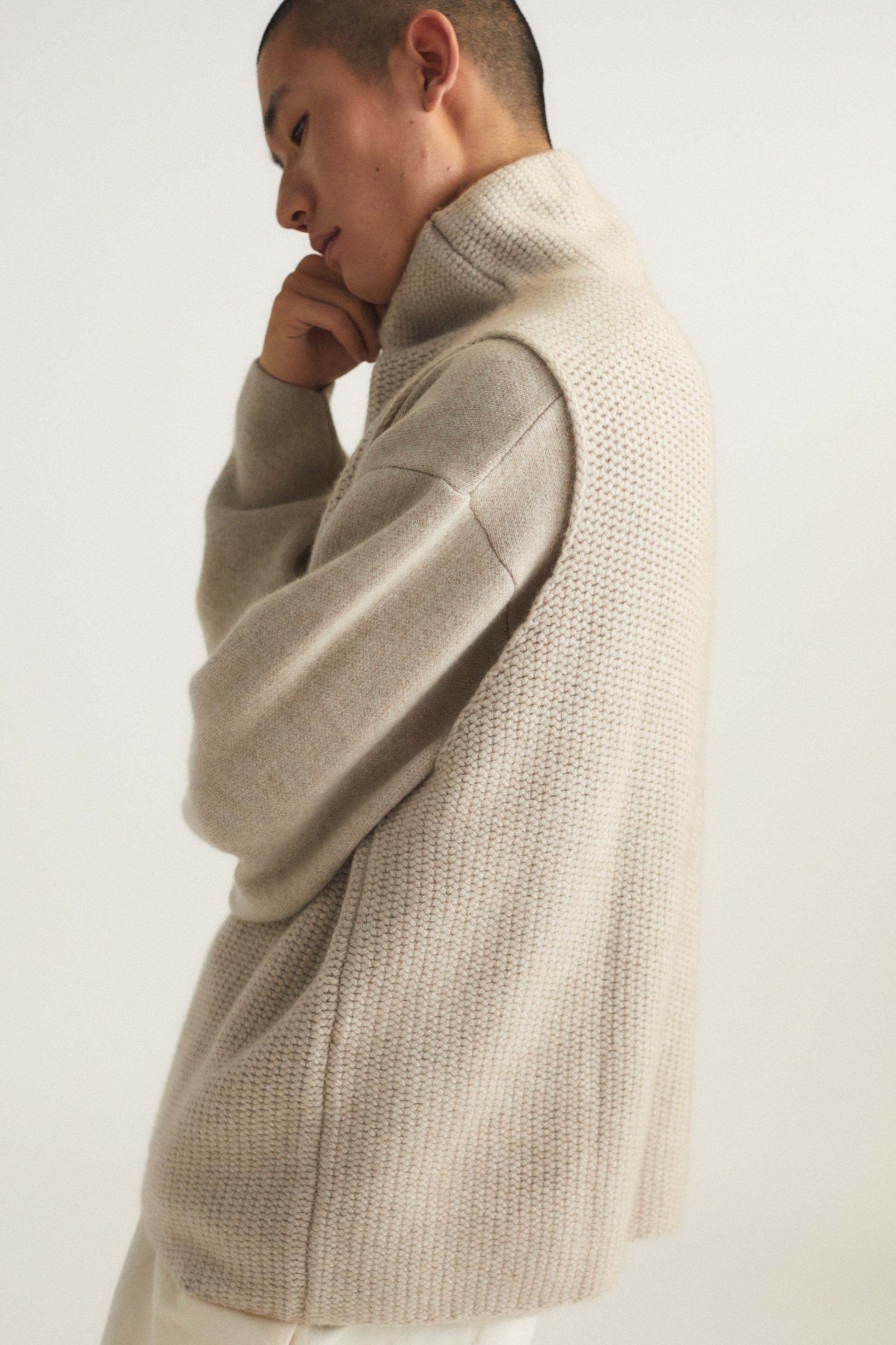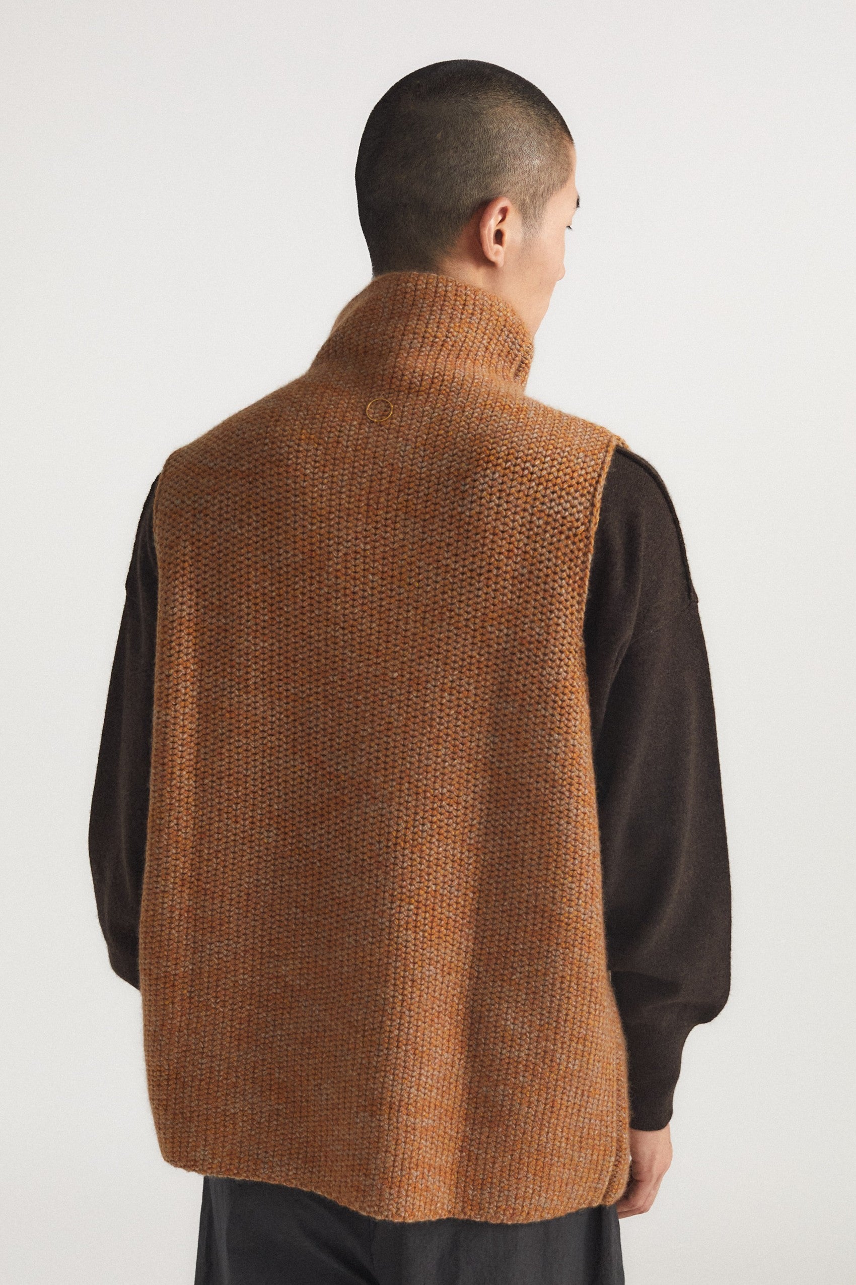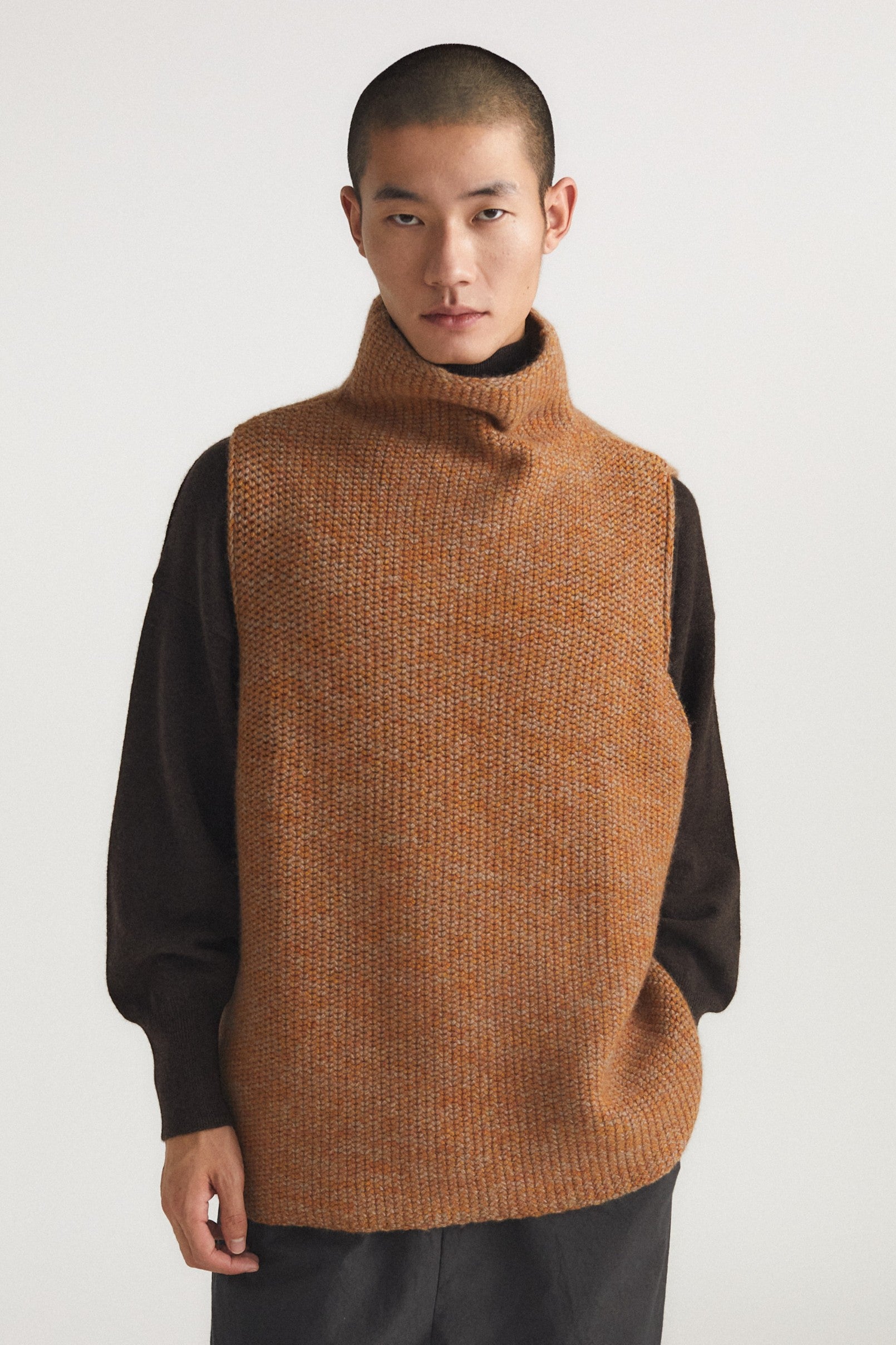 Knitted chunky sleeveless top with rich texture and subtle softness. Perfect for layering, it brings effortless elegance and versatility to any wardrobe. It can be styled over a shirt or vest.