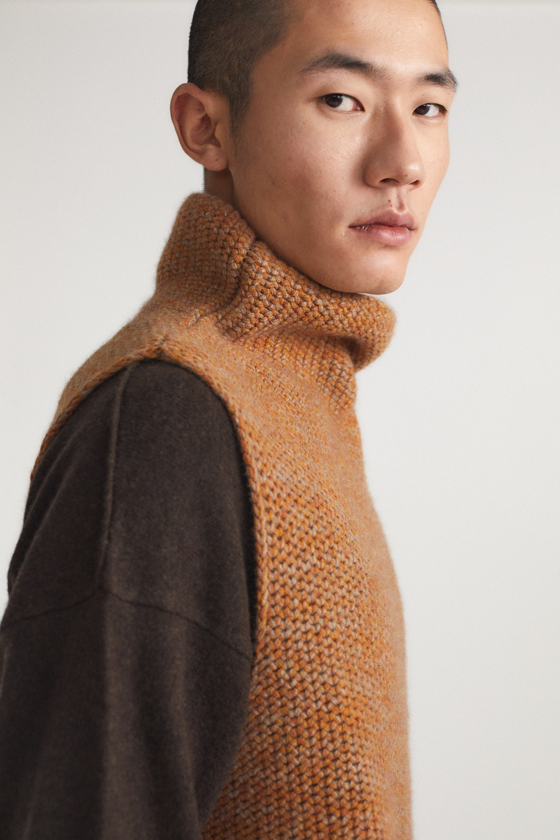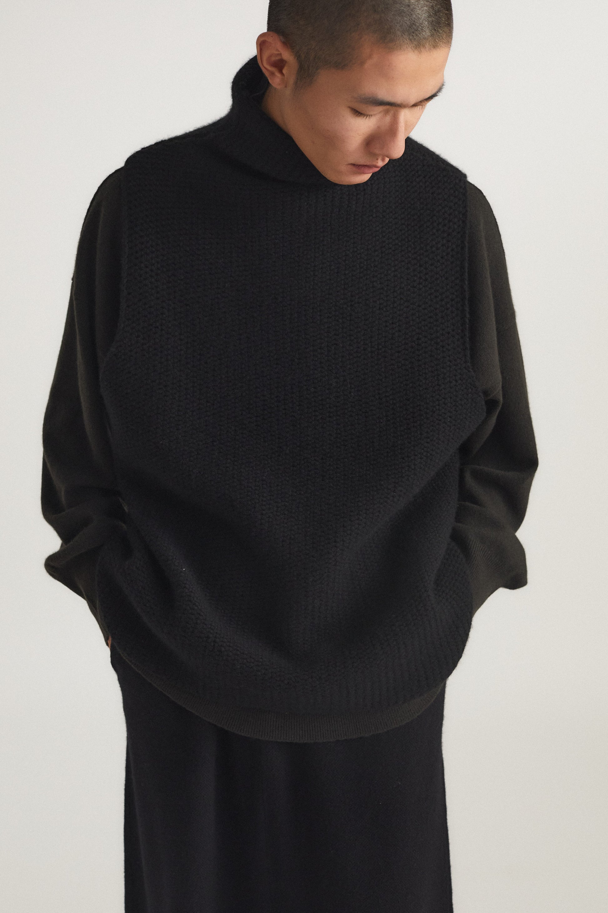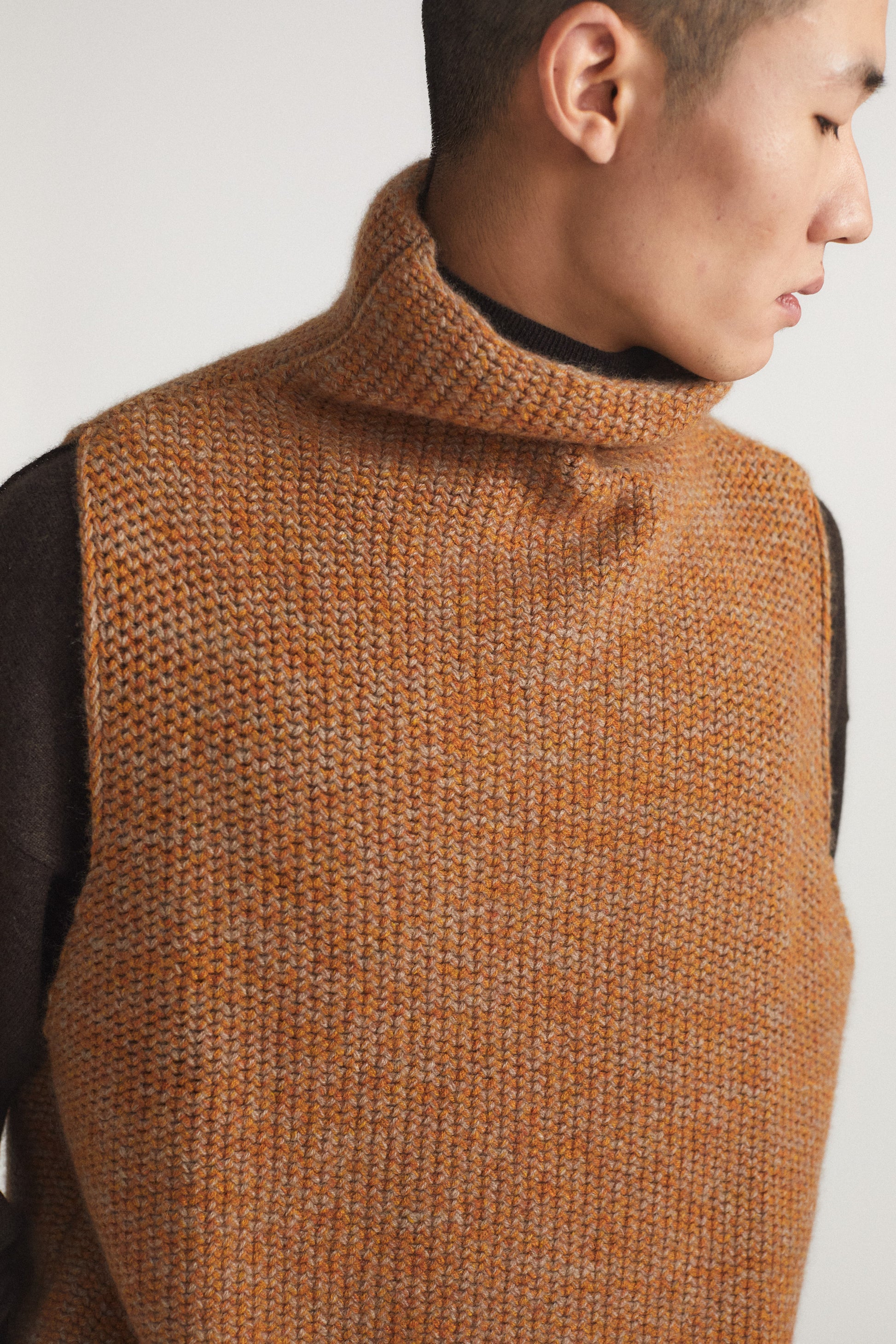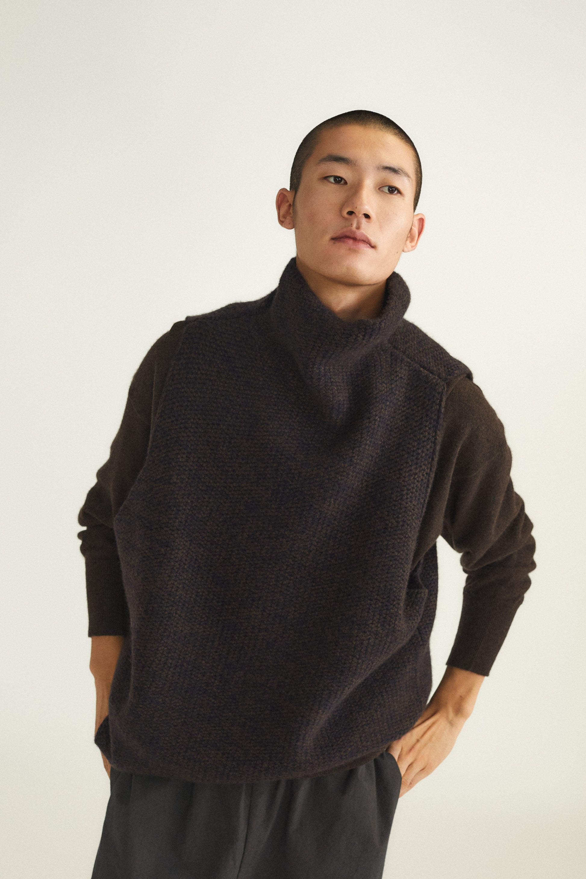 Knitted chunky sleeveless top with rich texture and subtle softness. Perfect for layering, it brings effortless elegance and versatility to any wardrobe. It can be styled over a shirt or vest.