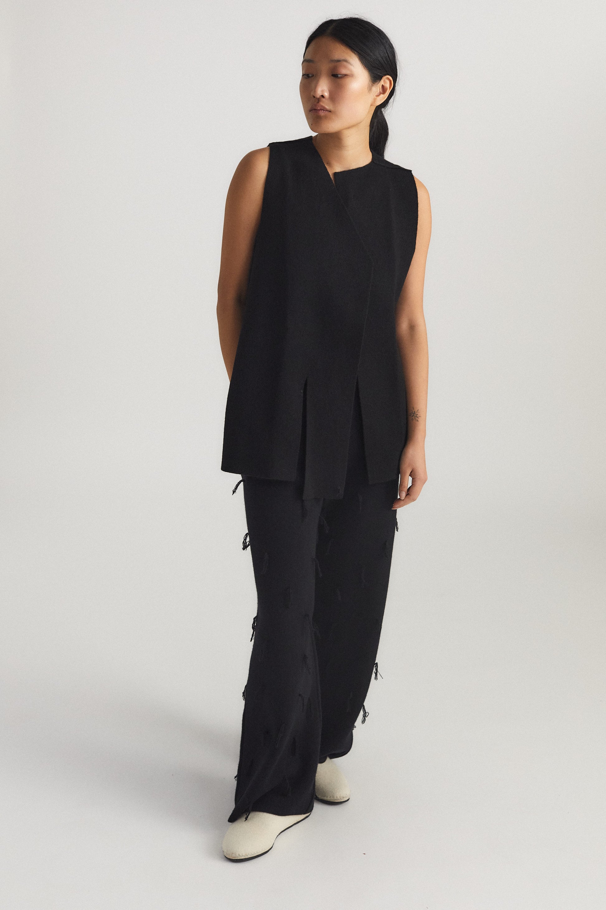 Asymmetric cashmere sleeveless jacket with a slit detail on the front left panel. Slit and button detail at front hem.
