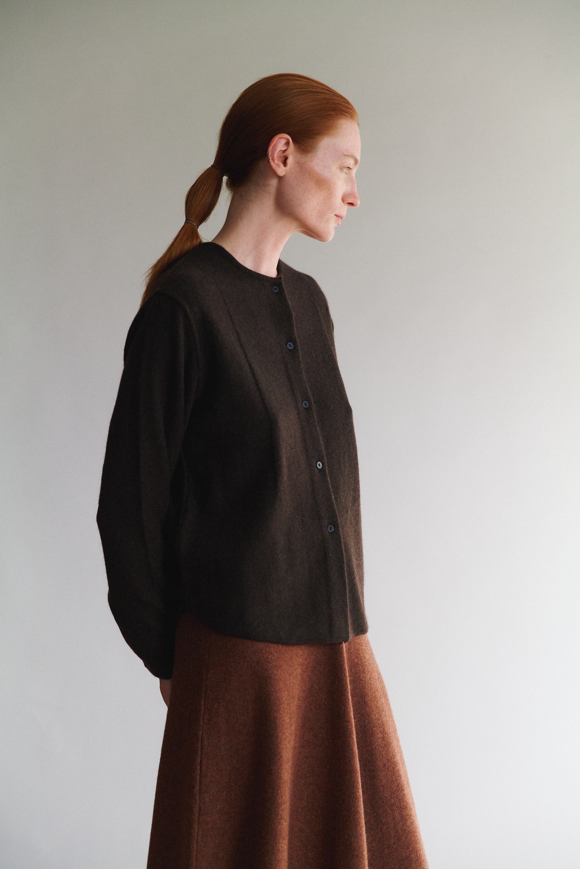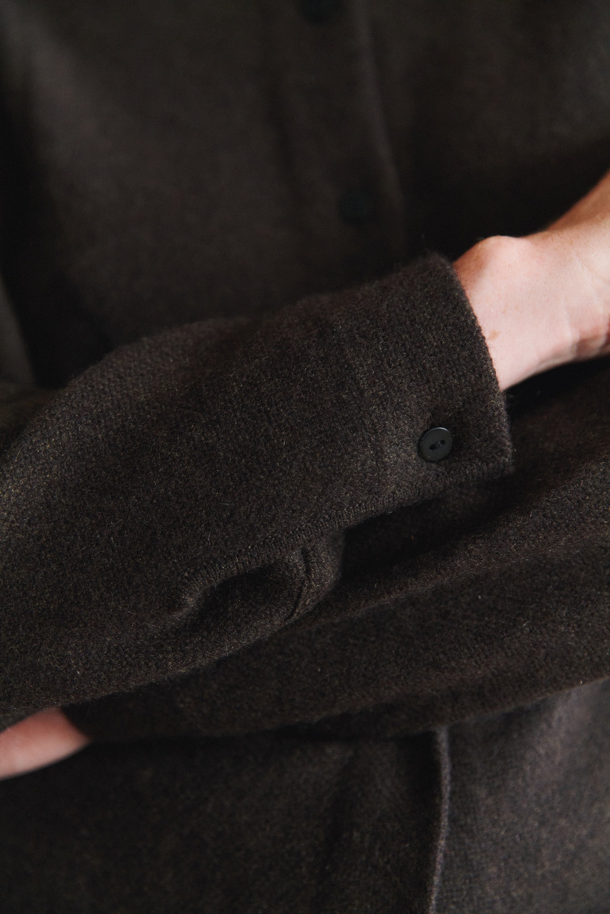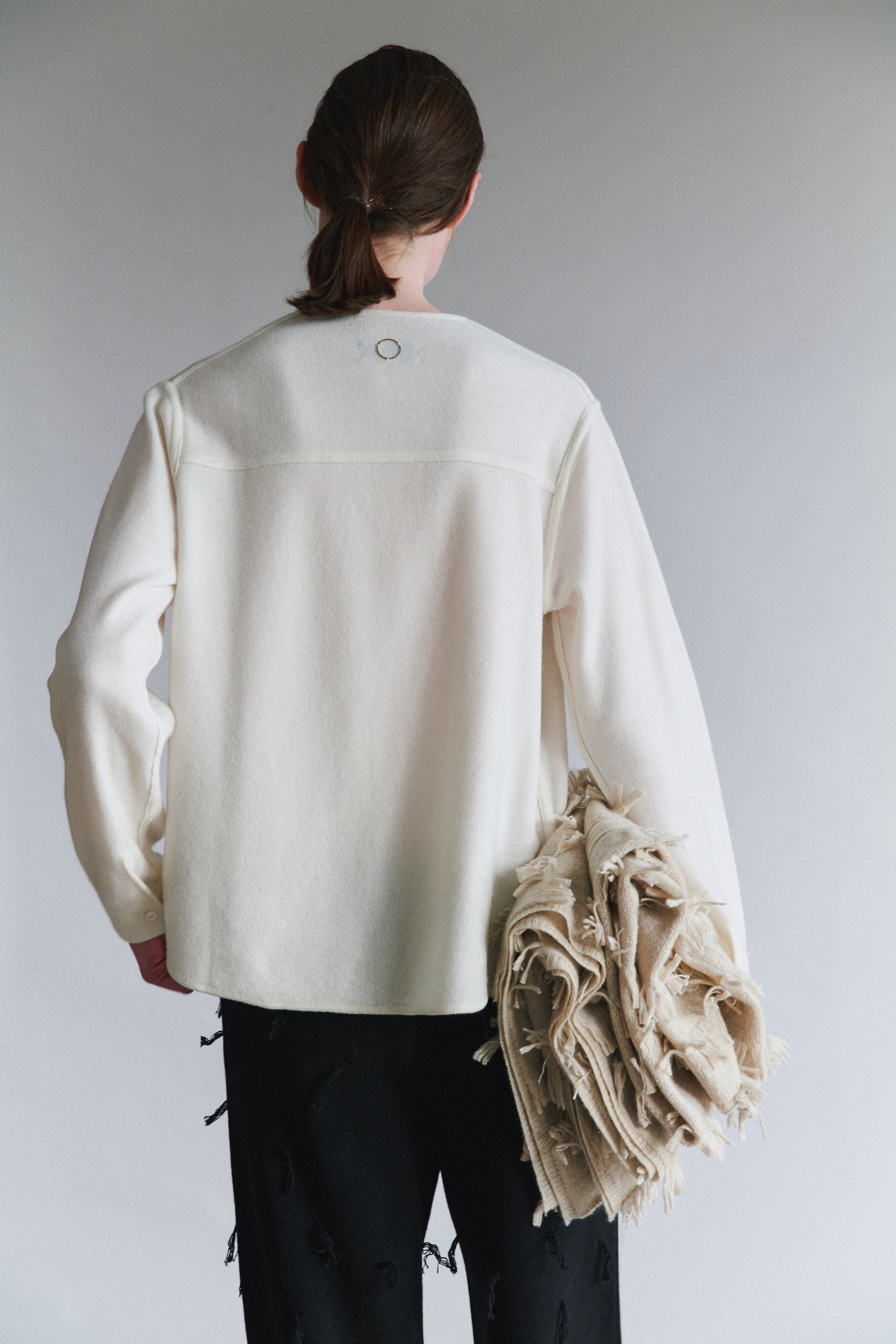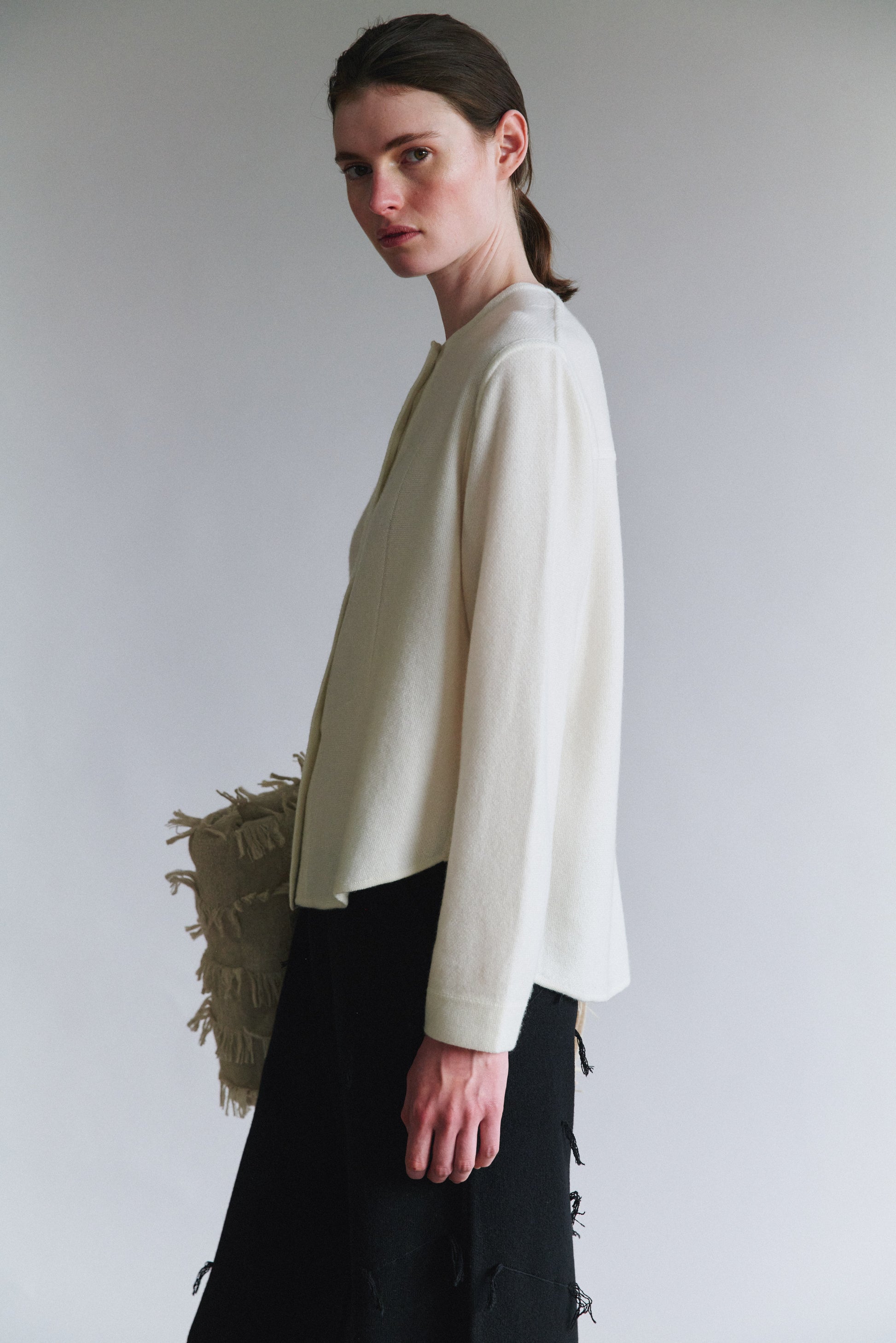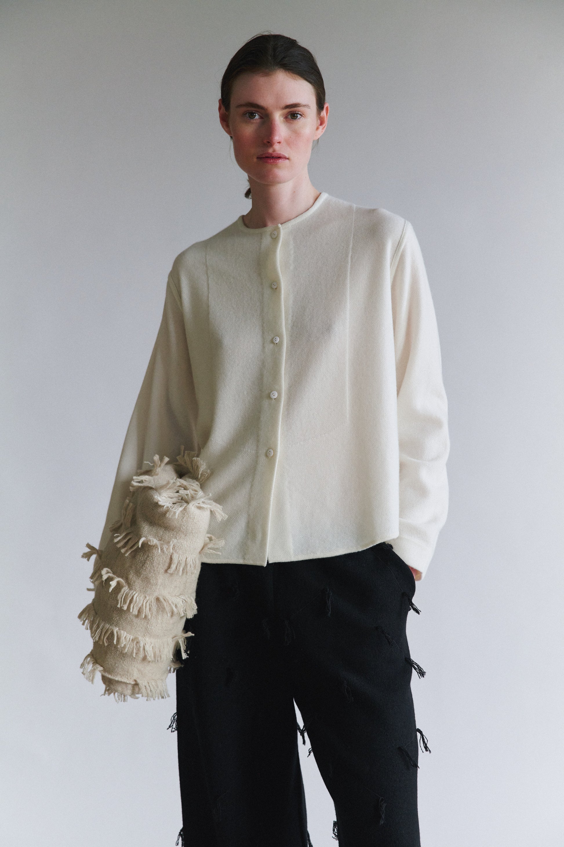Our cashmere take on a classic tuxedo shirt. This architectural piece is crafted with a half-knit and half-weave technique that stretches where it needs to and maintains its shape where it should. Lightweight yet robust, it can be styled up for evening wear or worn as a casual top for work.