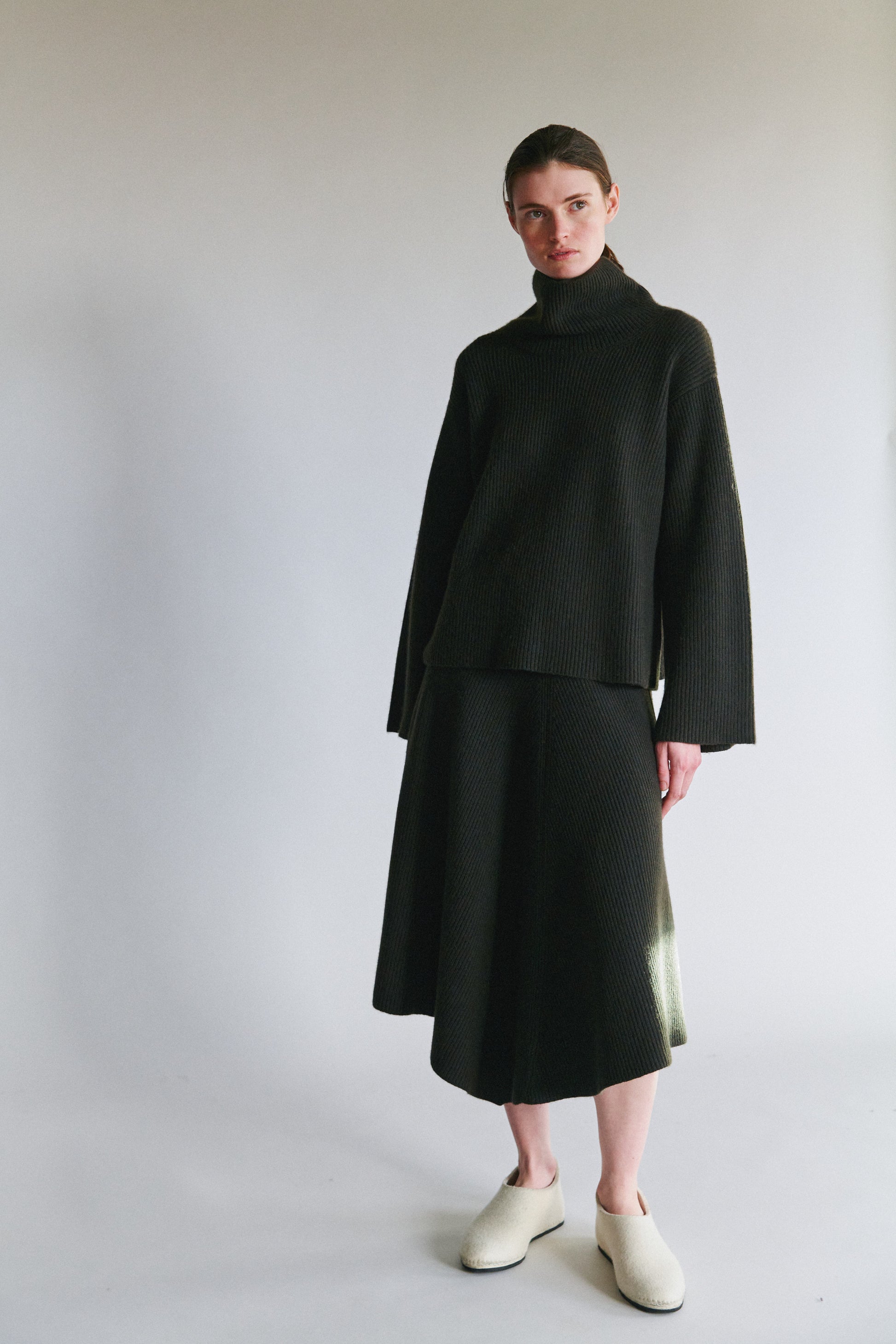 A striking rib knit asymmetric skirt with a sculptural silhouette. Luxuriously soft and textured, this elegant piece offers sophisticated warmth when the temperature drops.