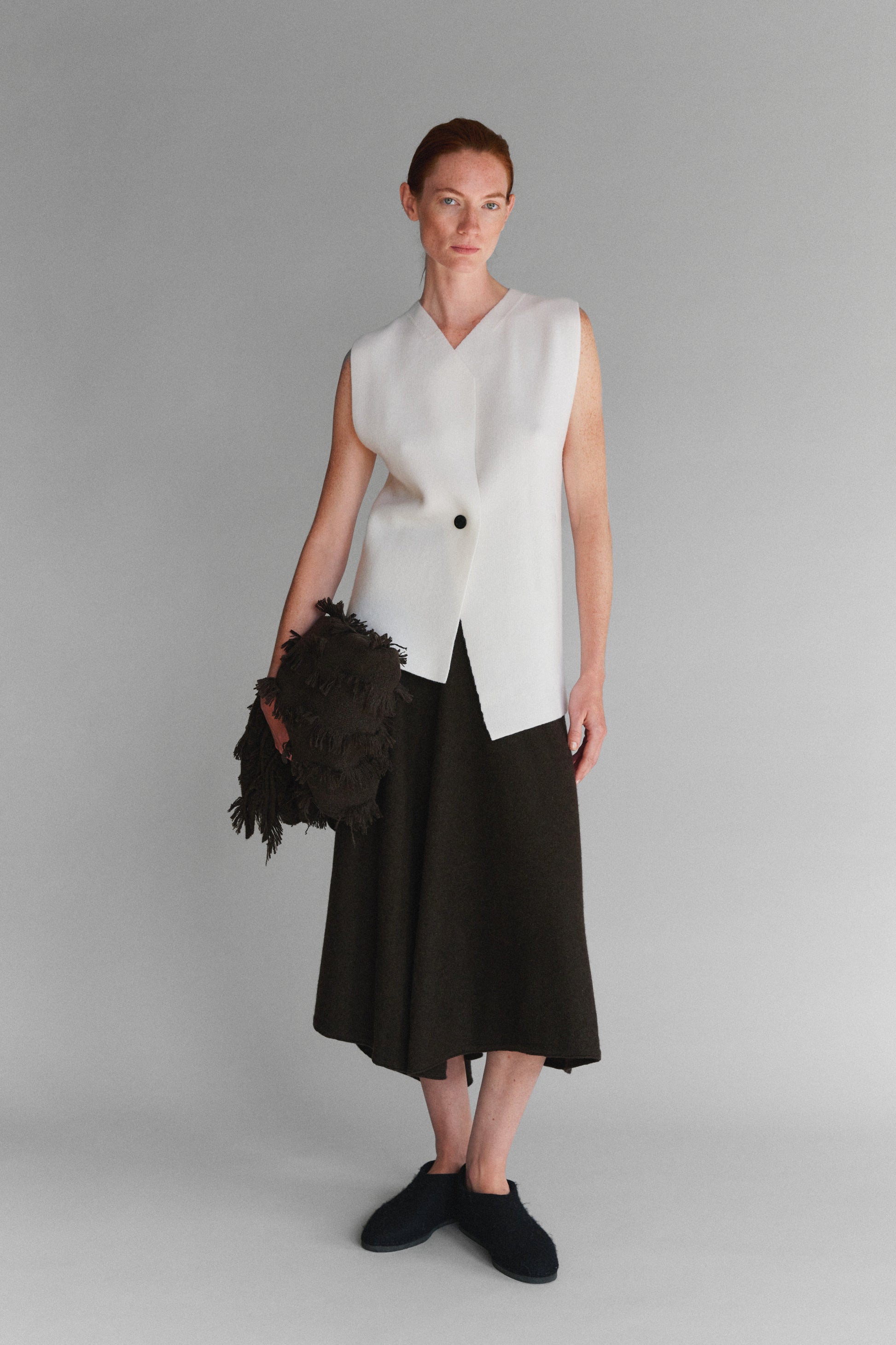 A clean-cut, architecturally inspired sleeveless jacket with a refined silhouette and single-button closure. It features a second buttonhole for a more fitted fastening option and creates a cool, effortless look when worn unbuttoned. Perfectly versatile; style it with skirts or trousers and layer over a blouse or long-sleeve top.