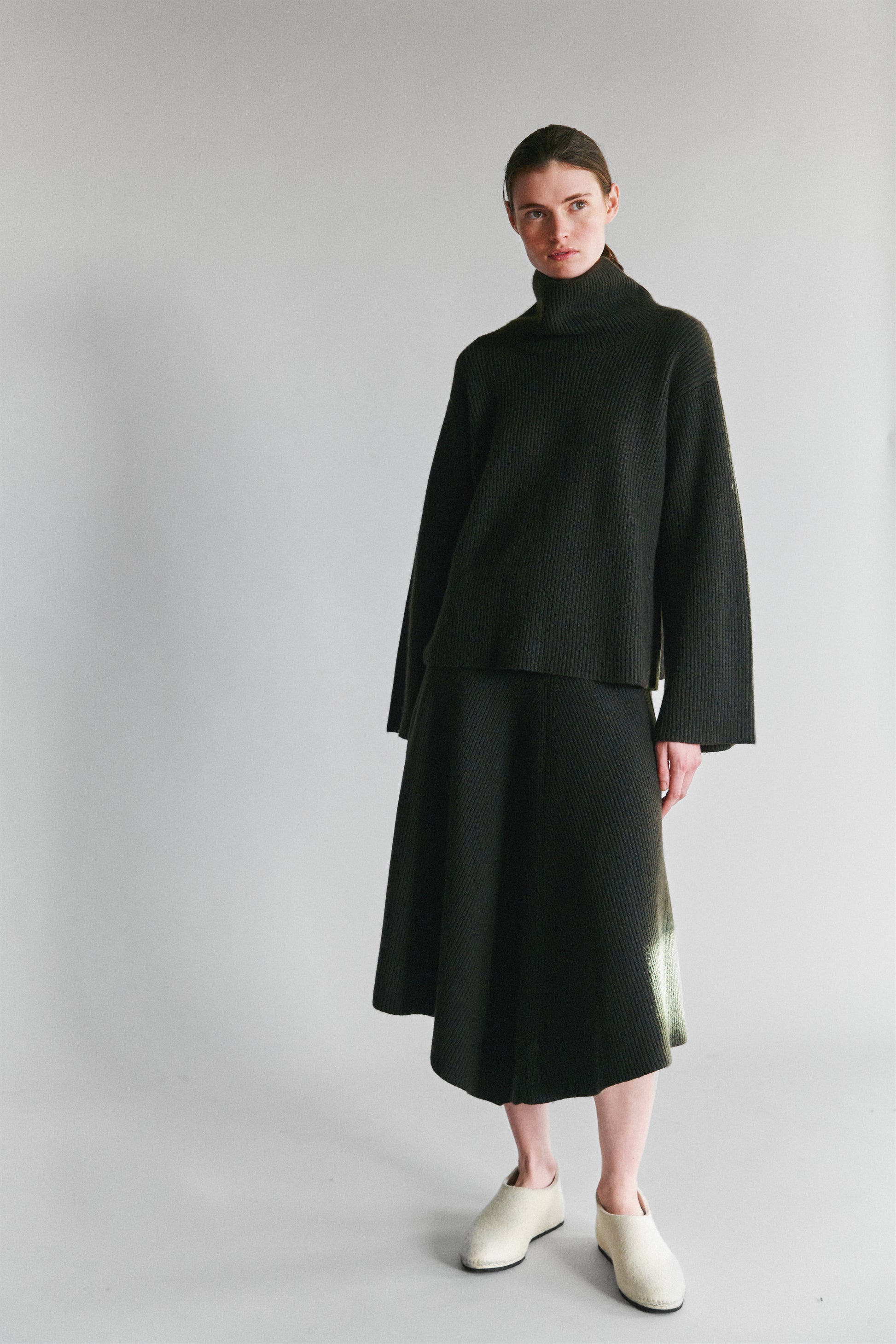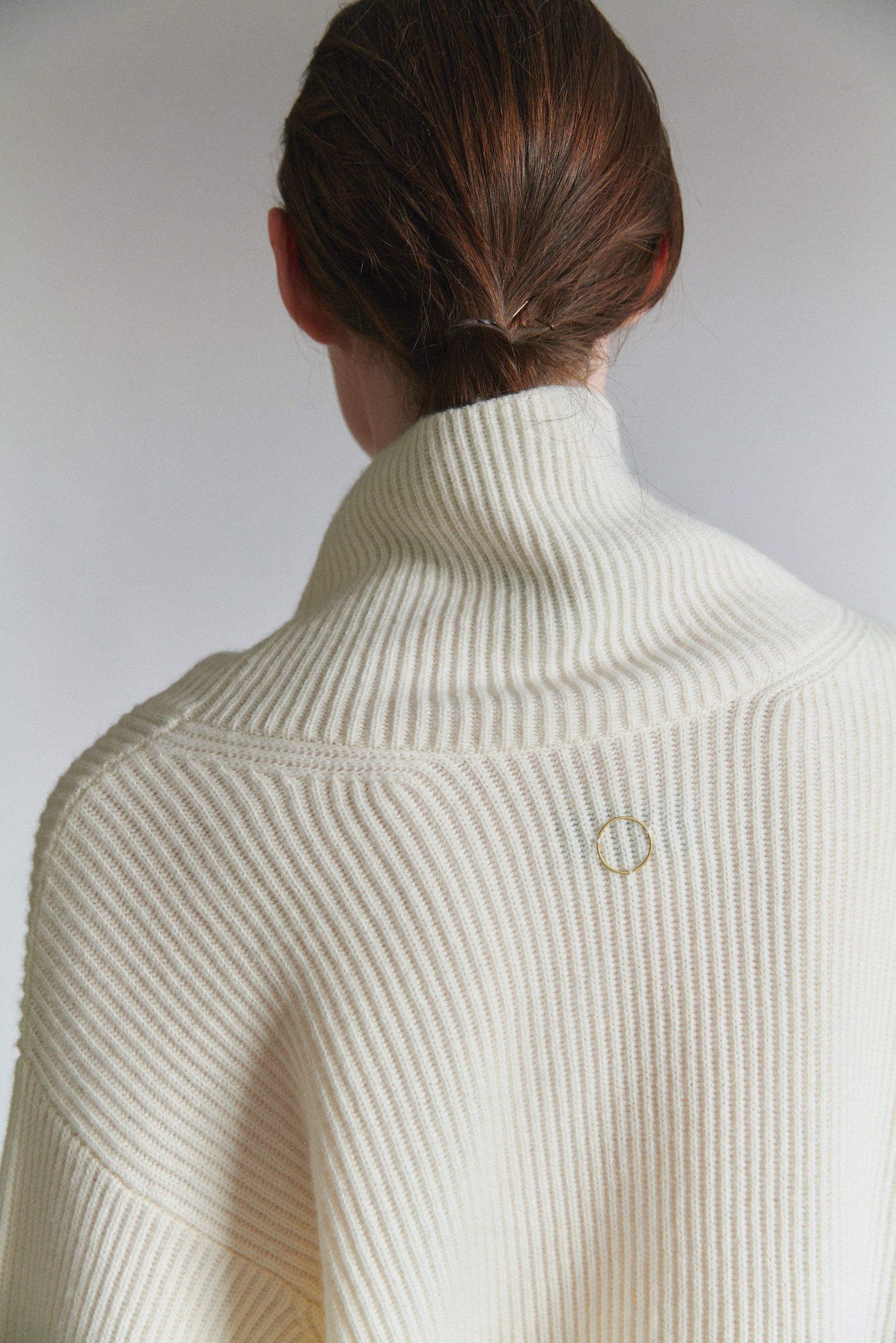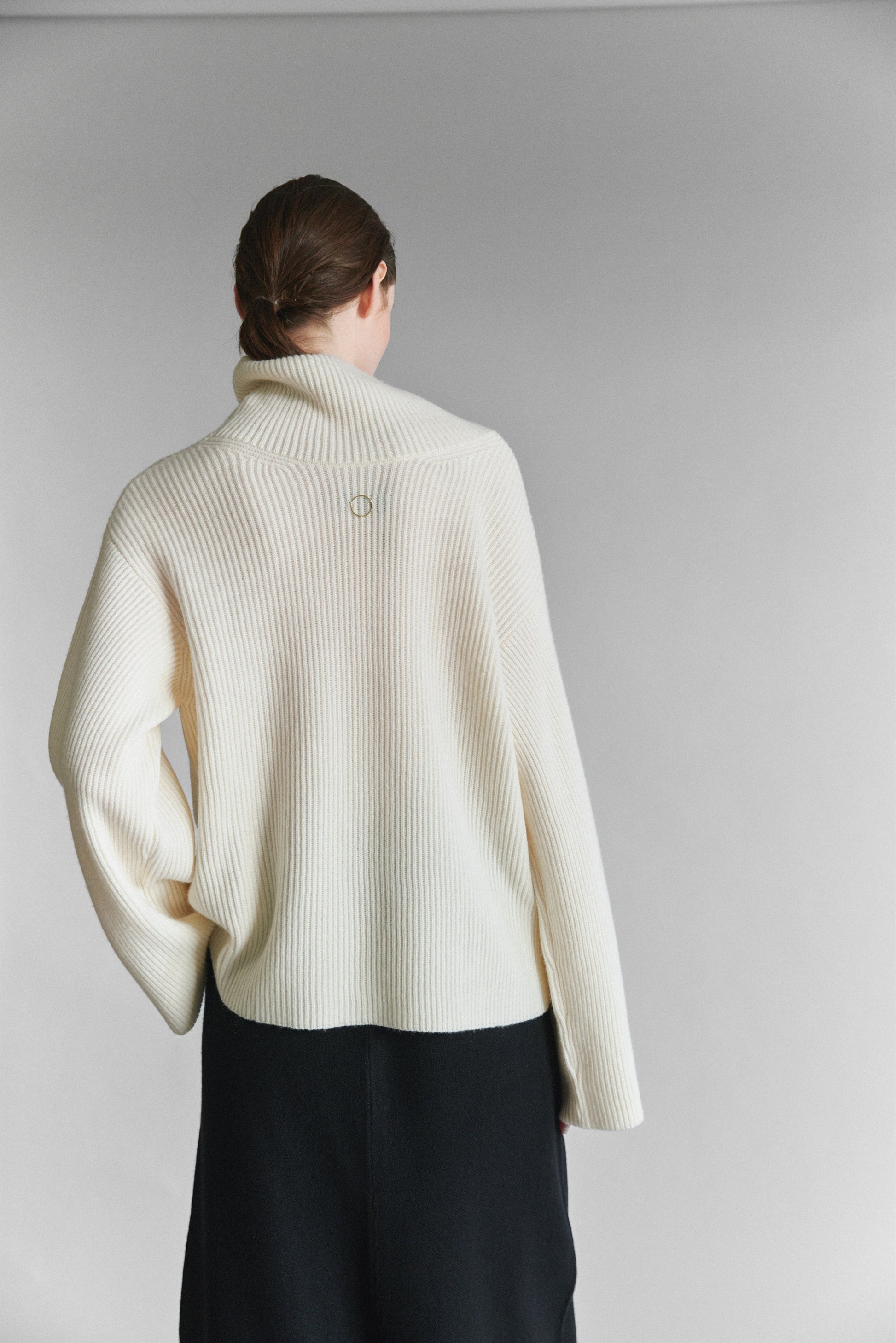 A relaxed-fit sweater with a high neck and generously cut, slightly tapered sleeves. Crafted in a soft rib-knit texture, the high neck sits comfortably, softly framing the face without feeling tight.