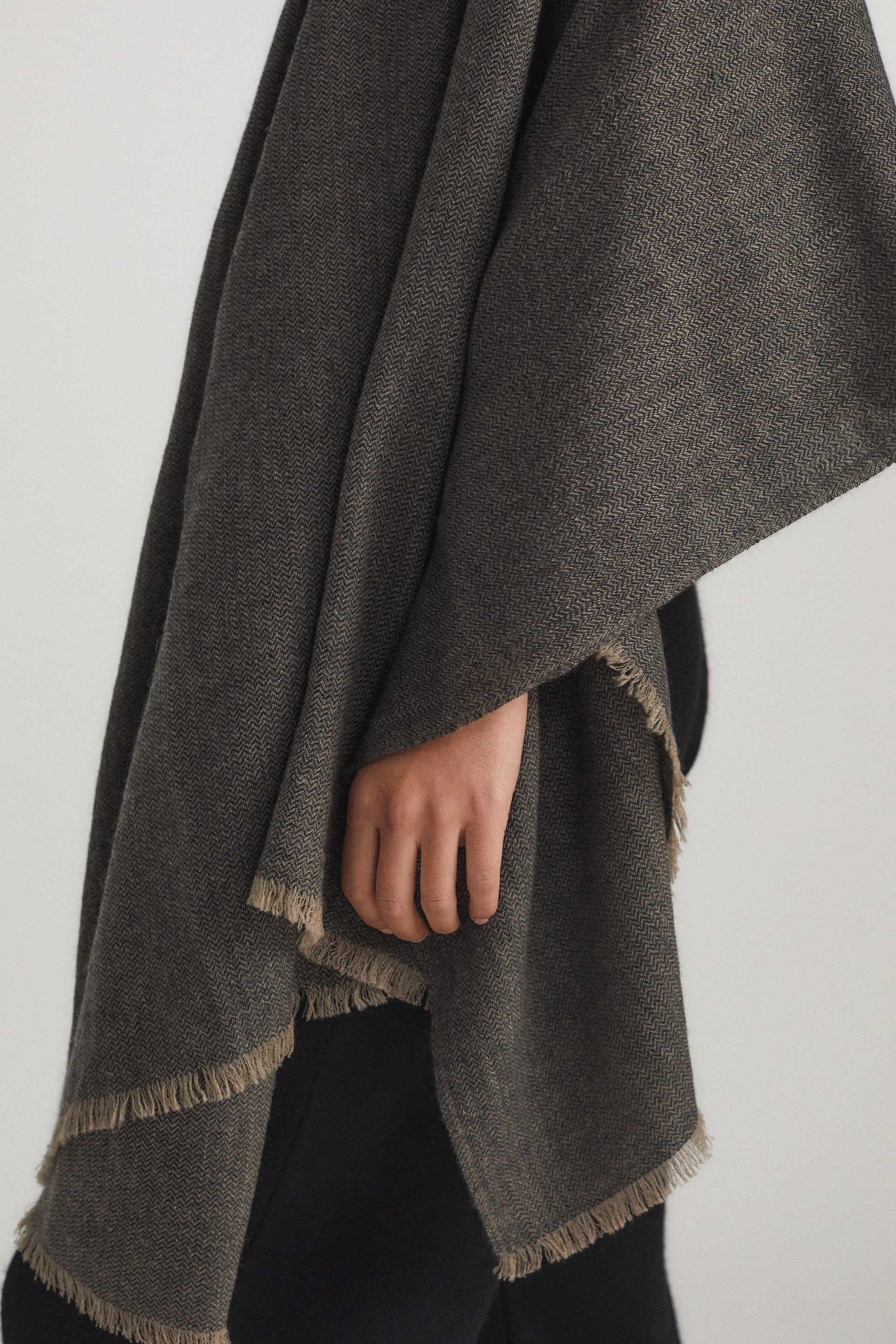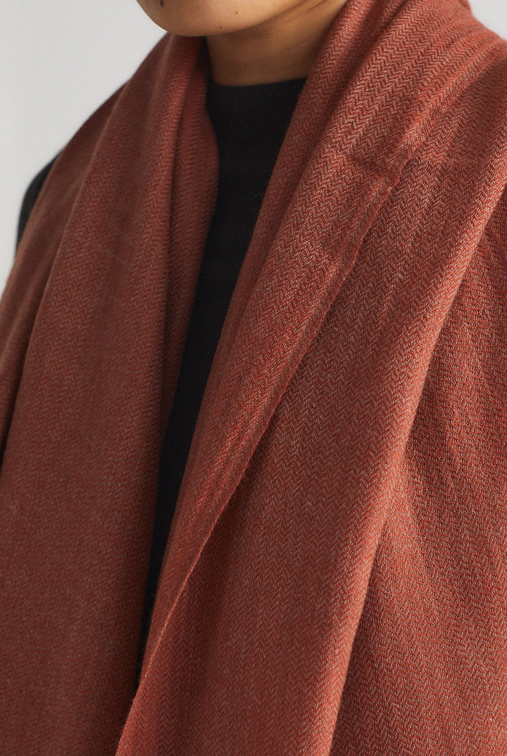 A finely woven throw with two-tone, classic herringbone design and soft, short fringing. It doubles as a refined throw for interiors as well as a generous wrap to indulge in, both indoors and outdoors.