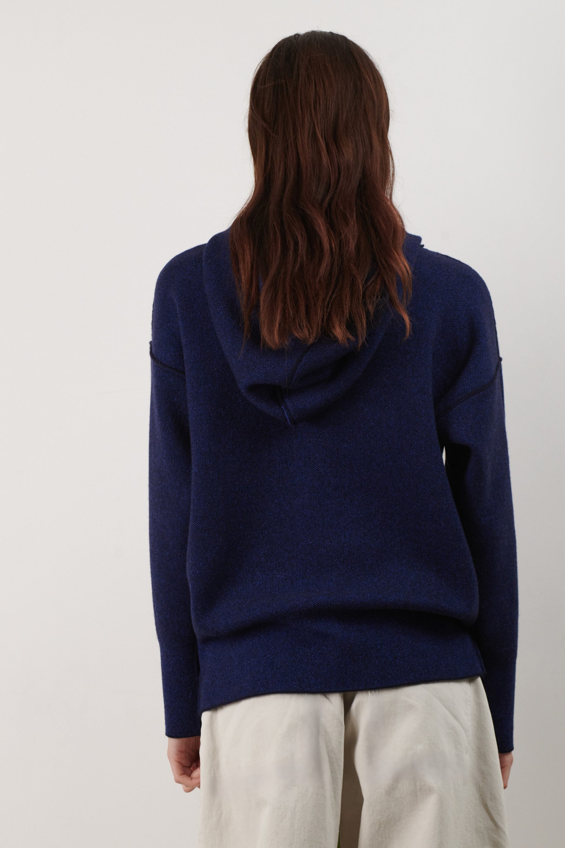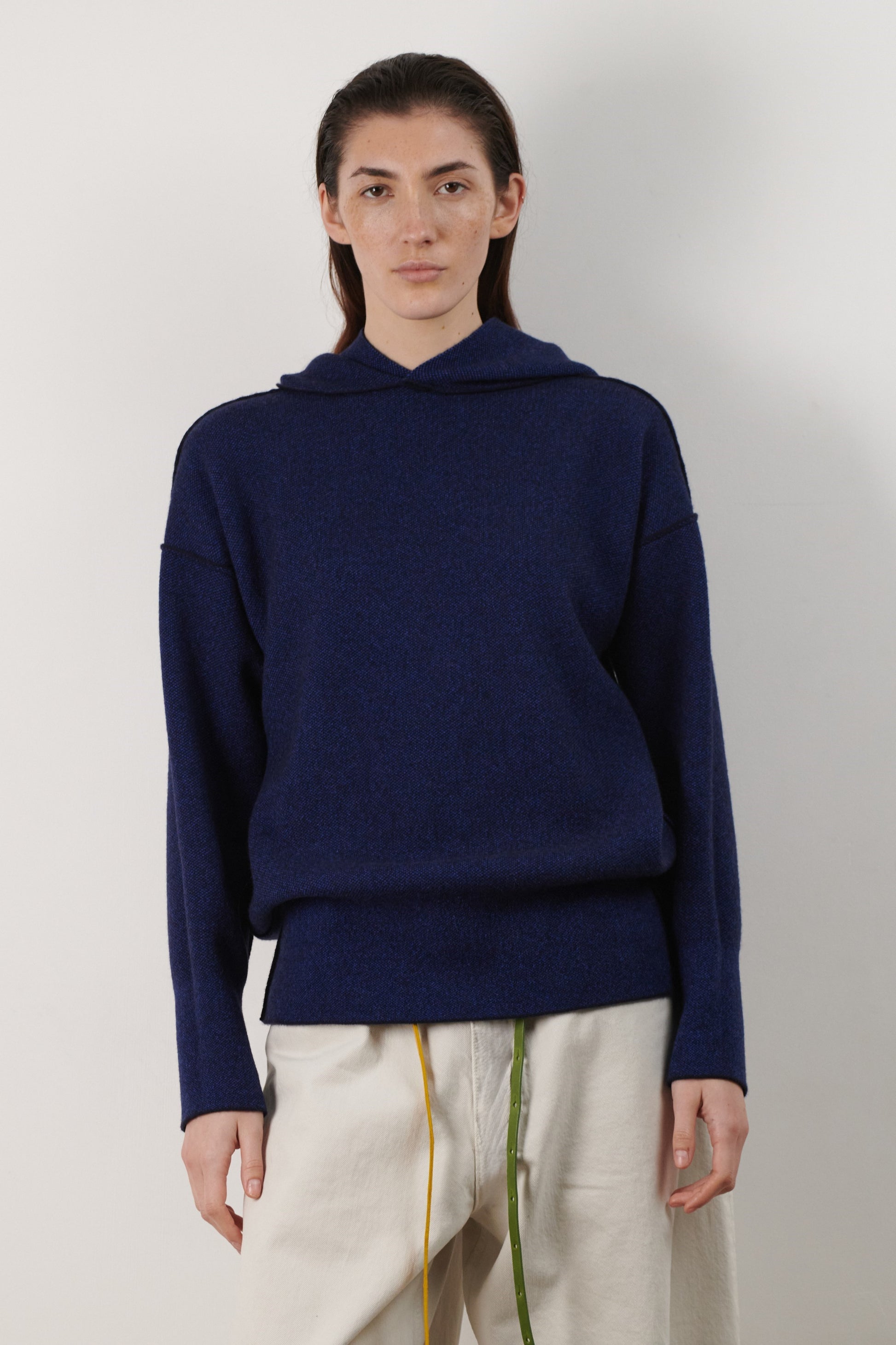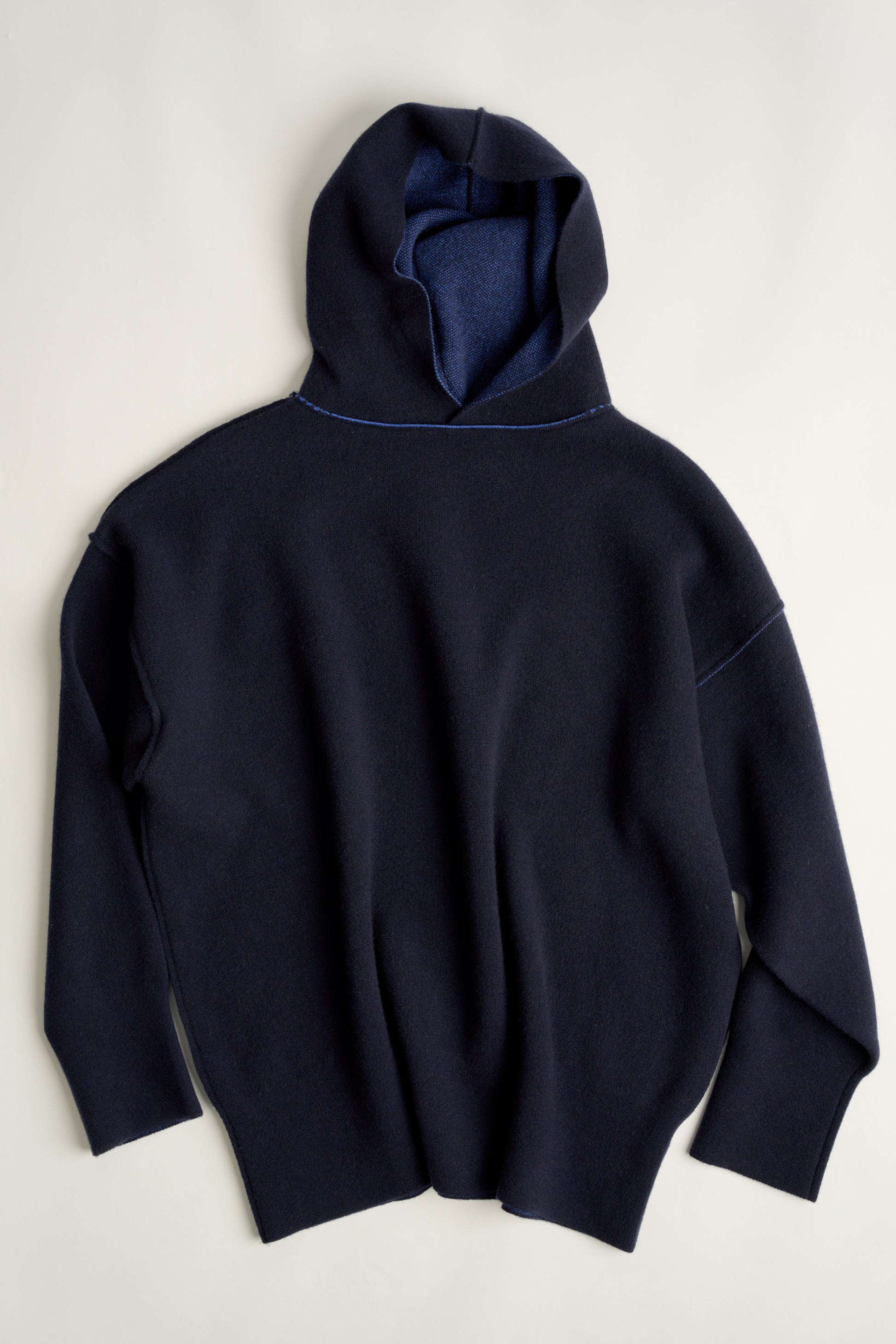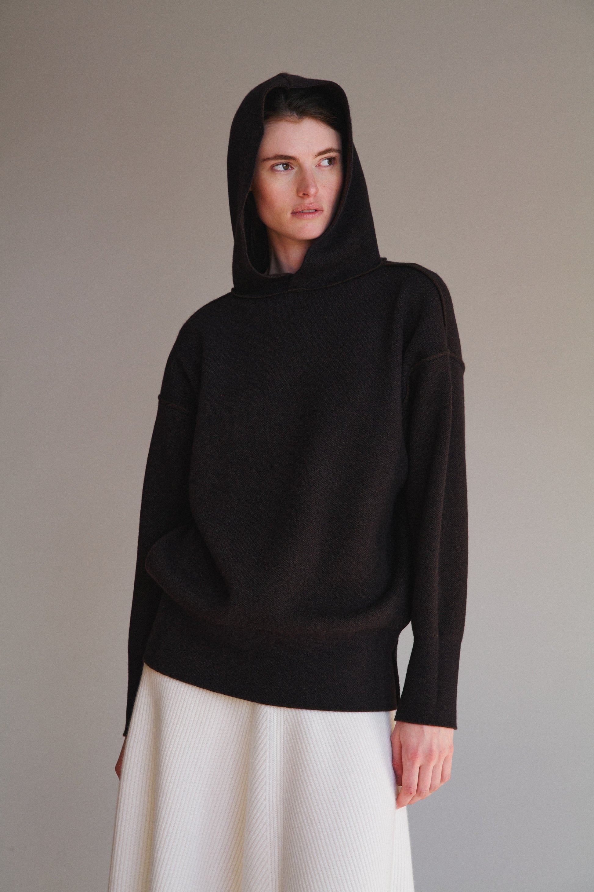 This is the best cashmere hoodie we have ever come across. The quietly modern and clean look of this hoodie is enhanced with laser-sharp seam detailing. Fully reversible. This hoodie works very well on different-shaped bodies. It feels like a soft sculpted hug.