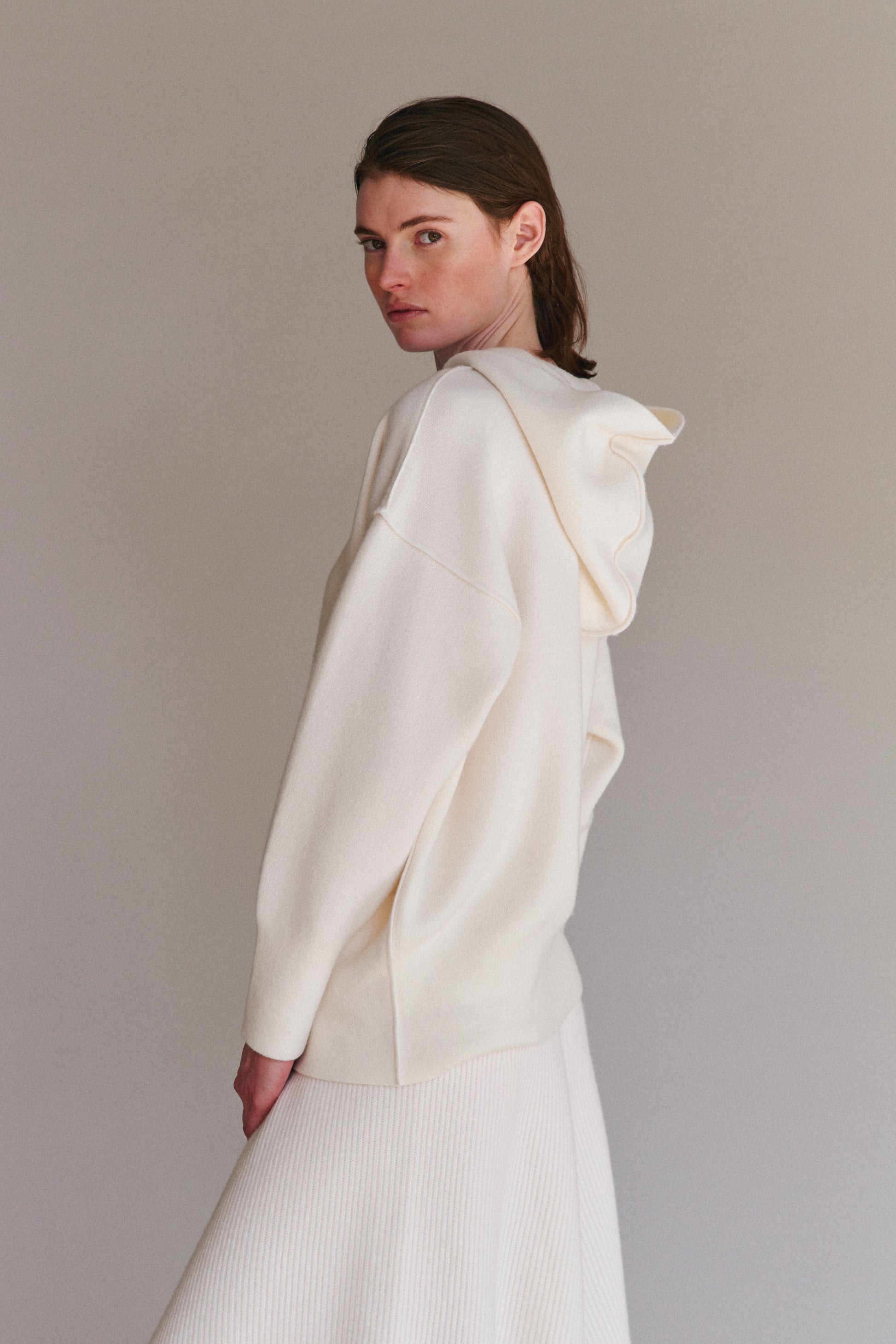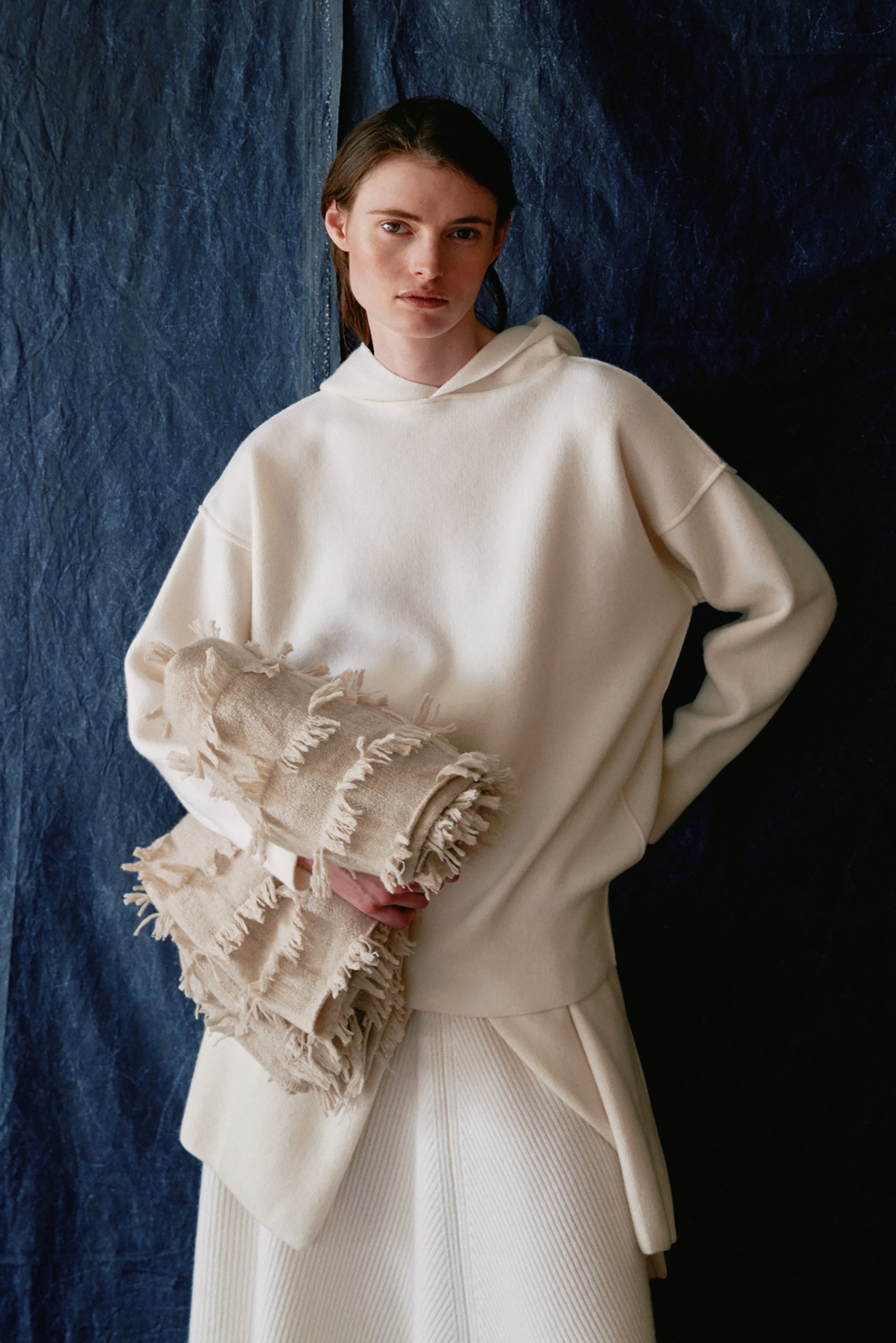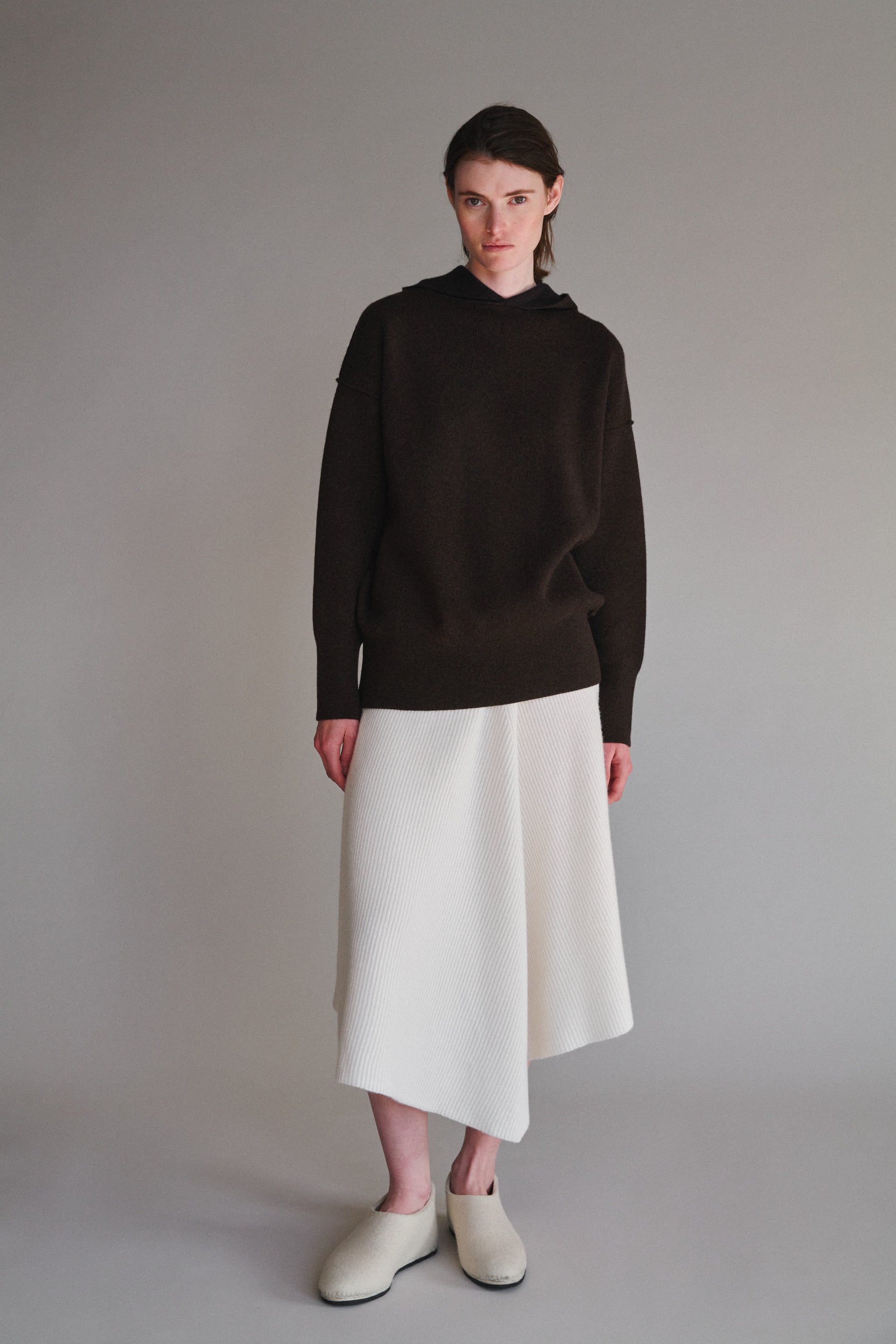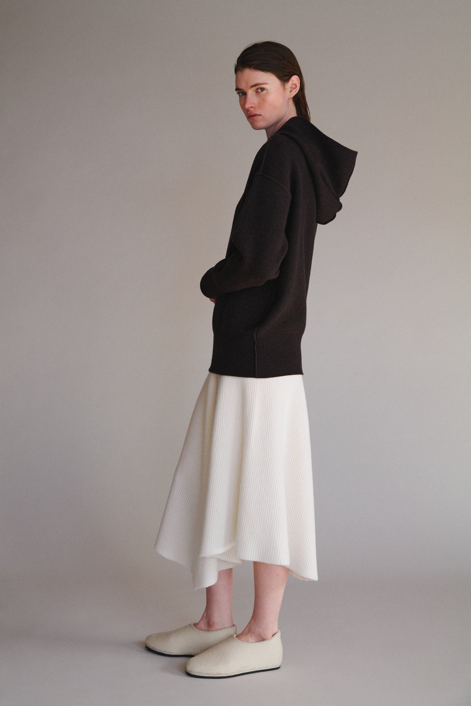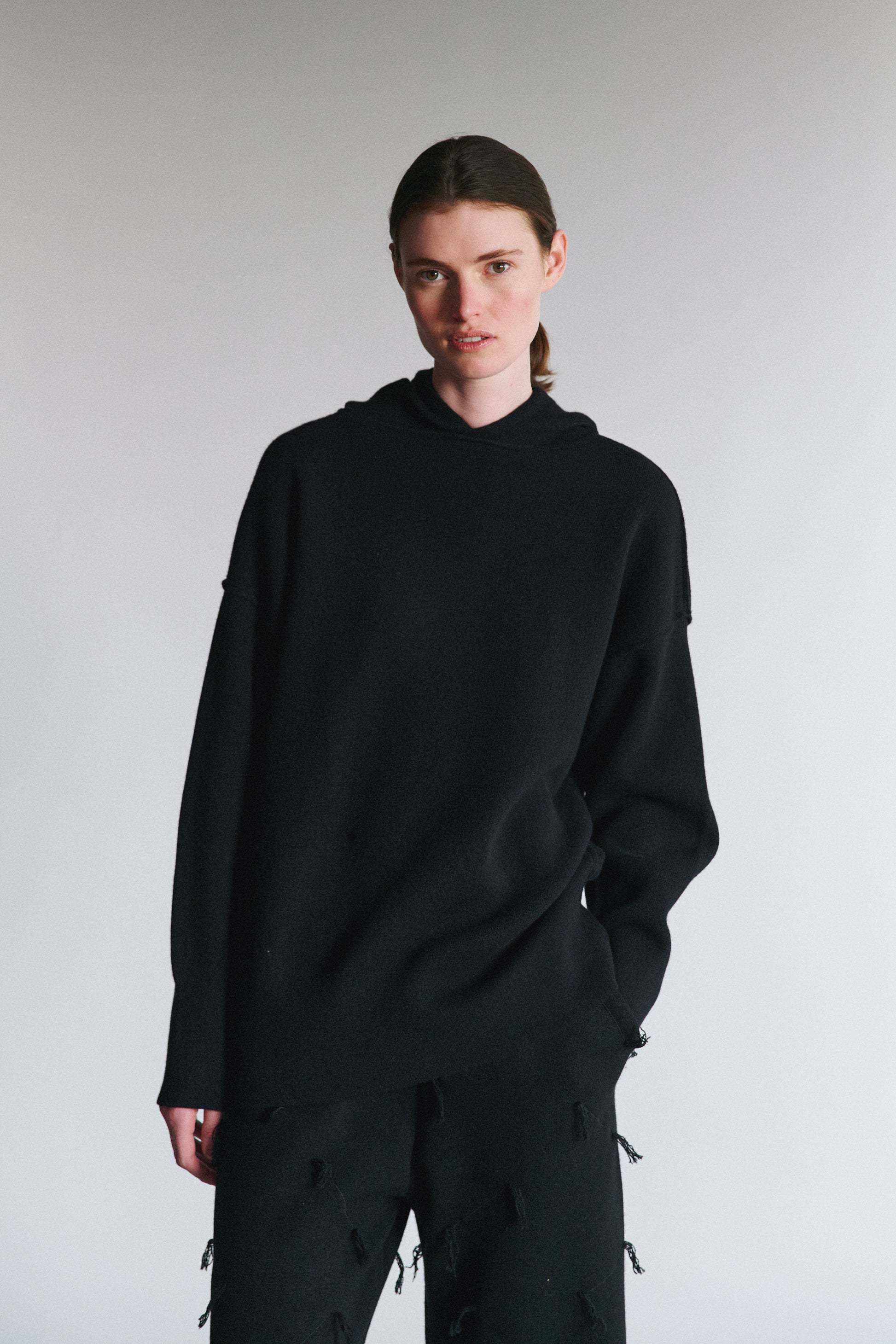 This is the best cashmere hoodie we have ever come across. The quietly modern and clean look of this hoodie is enhanced with laser-sharp seam detailing. Fully reversible. This hoodie works very well on different-shaped bodies. It feels like a soft sculpted hug.