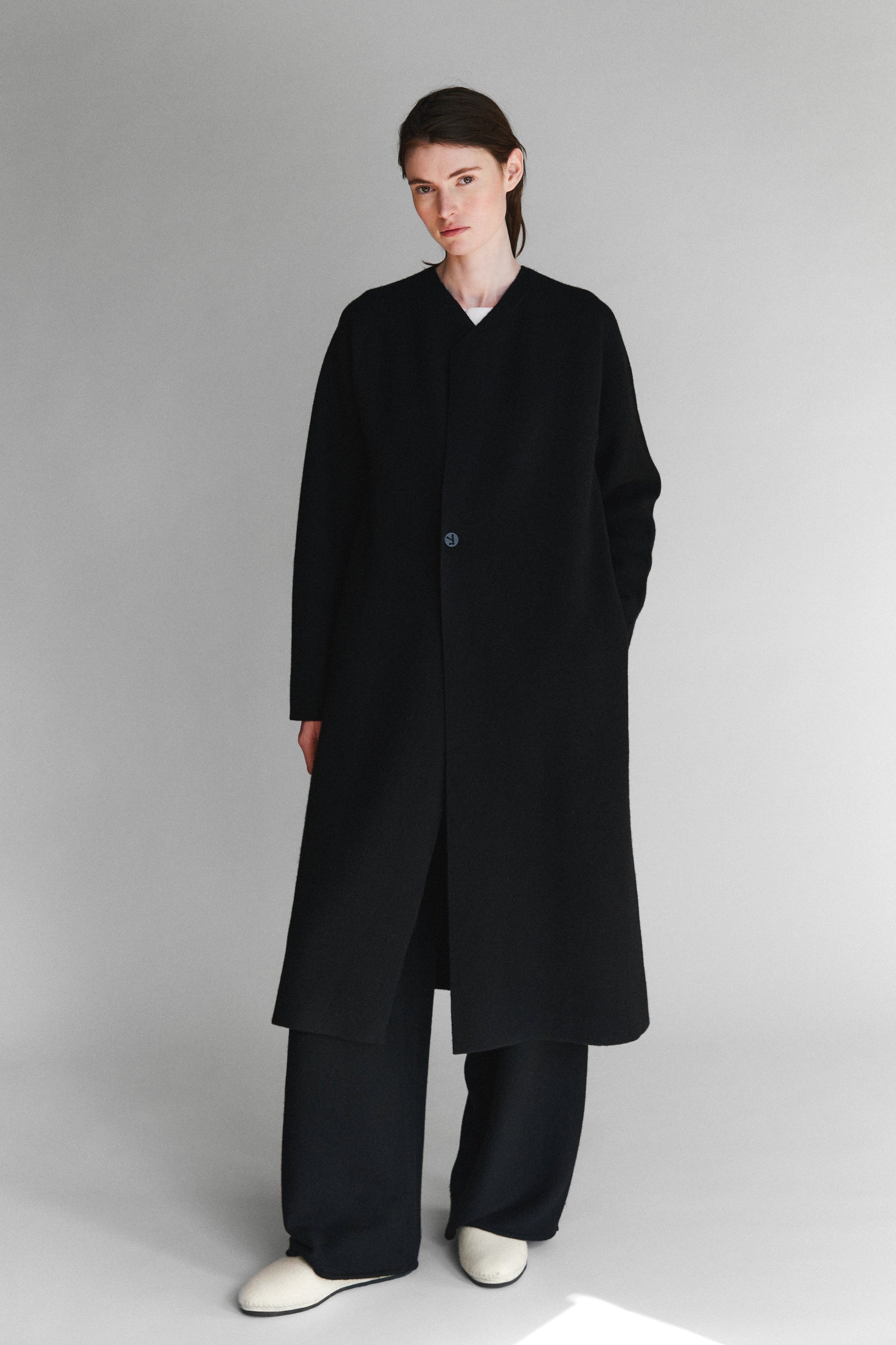 A lightweight yet warm, jacquard knit minimally sculpted cashmere wrap coat. Features below-knee length, side pockets, and a subtle overlapping front neckline. Drapes beautifully when worn open.