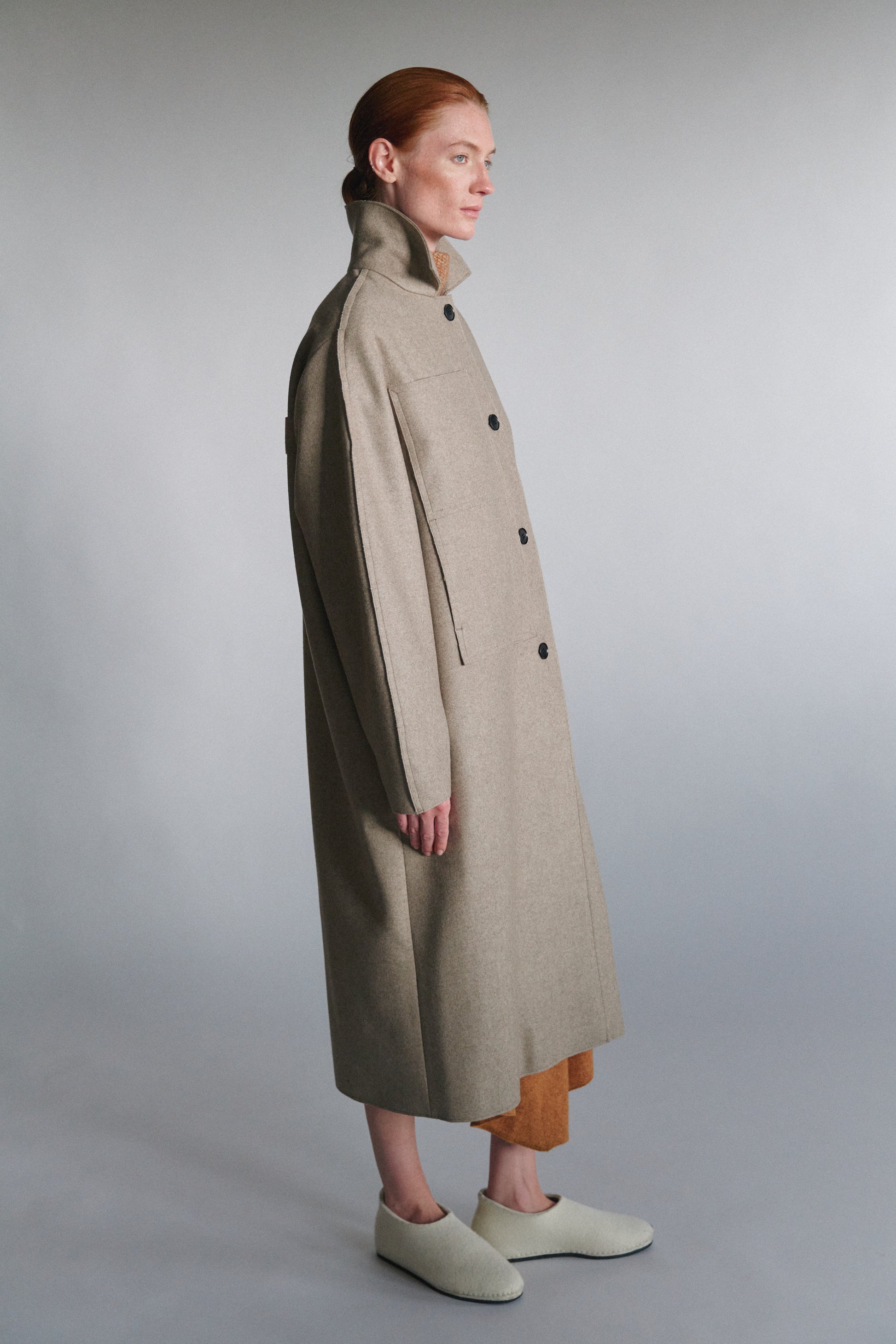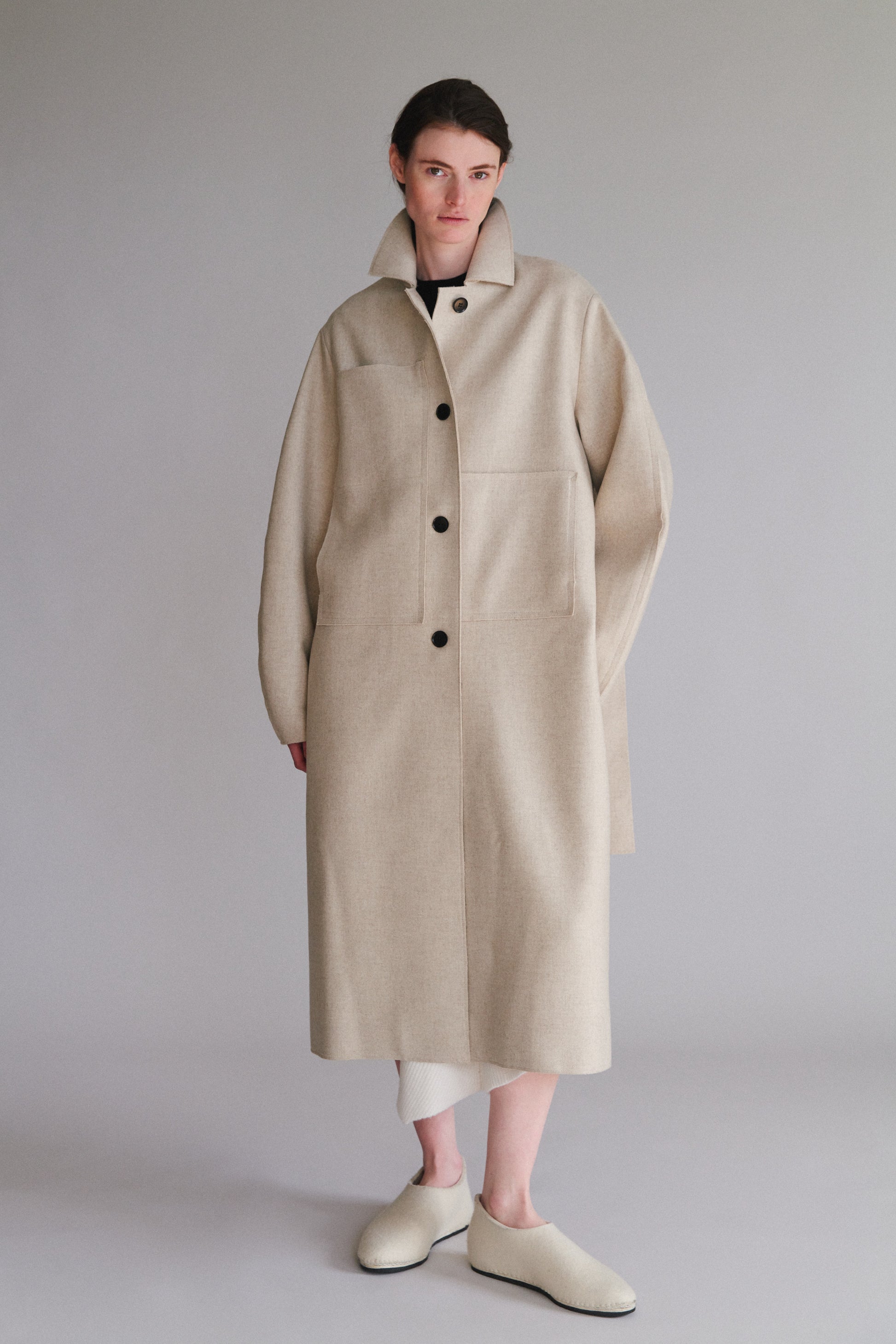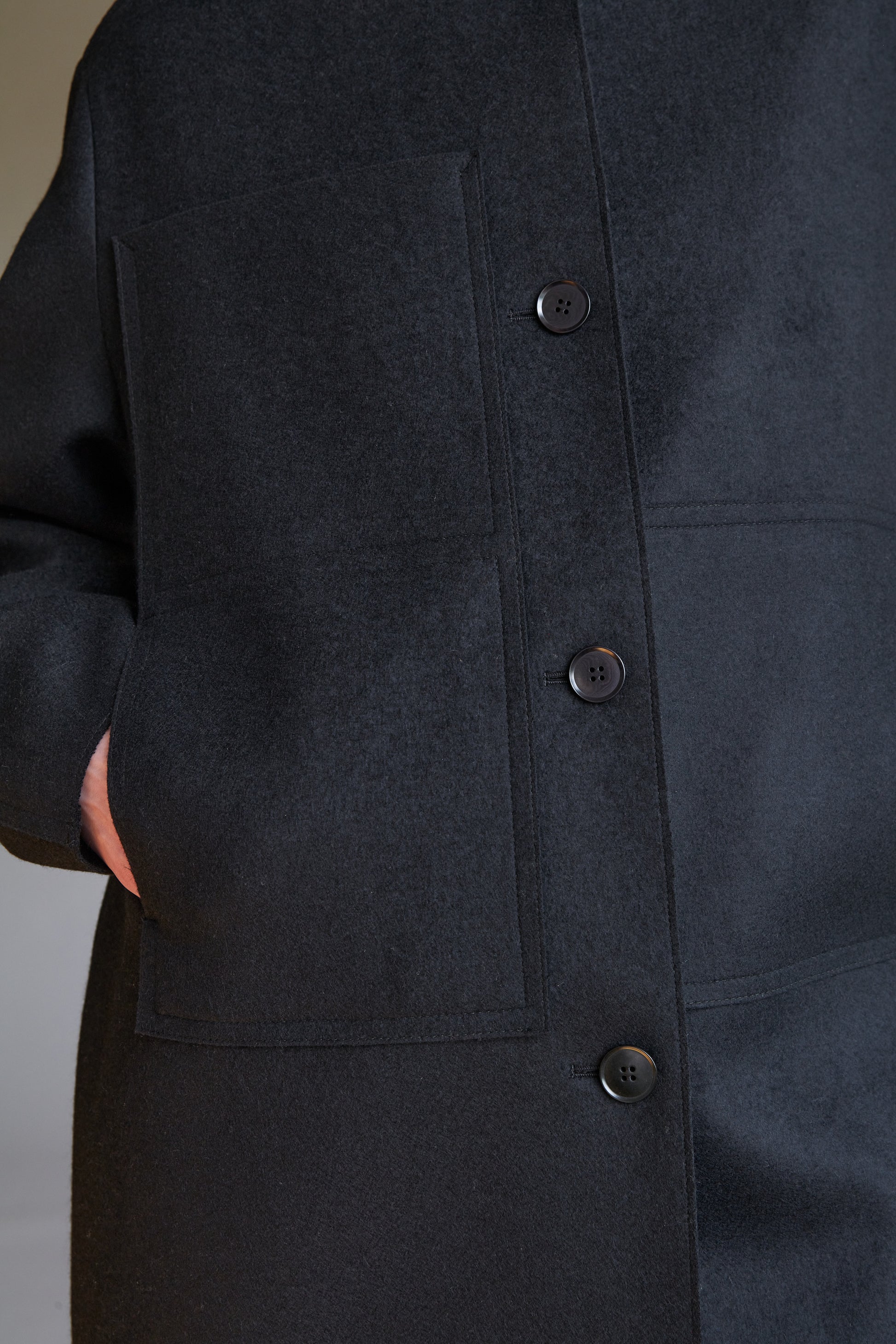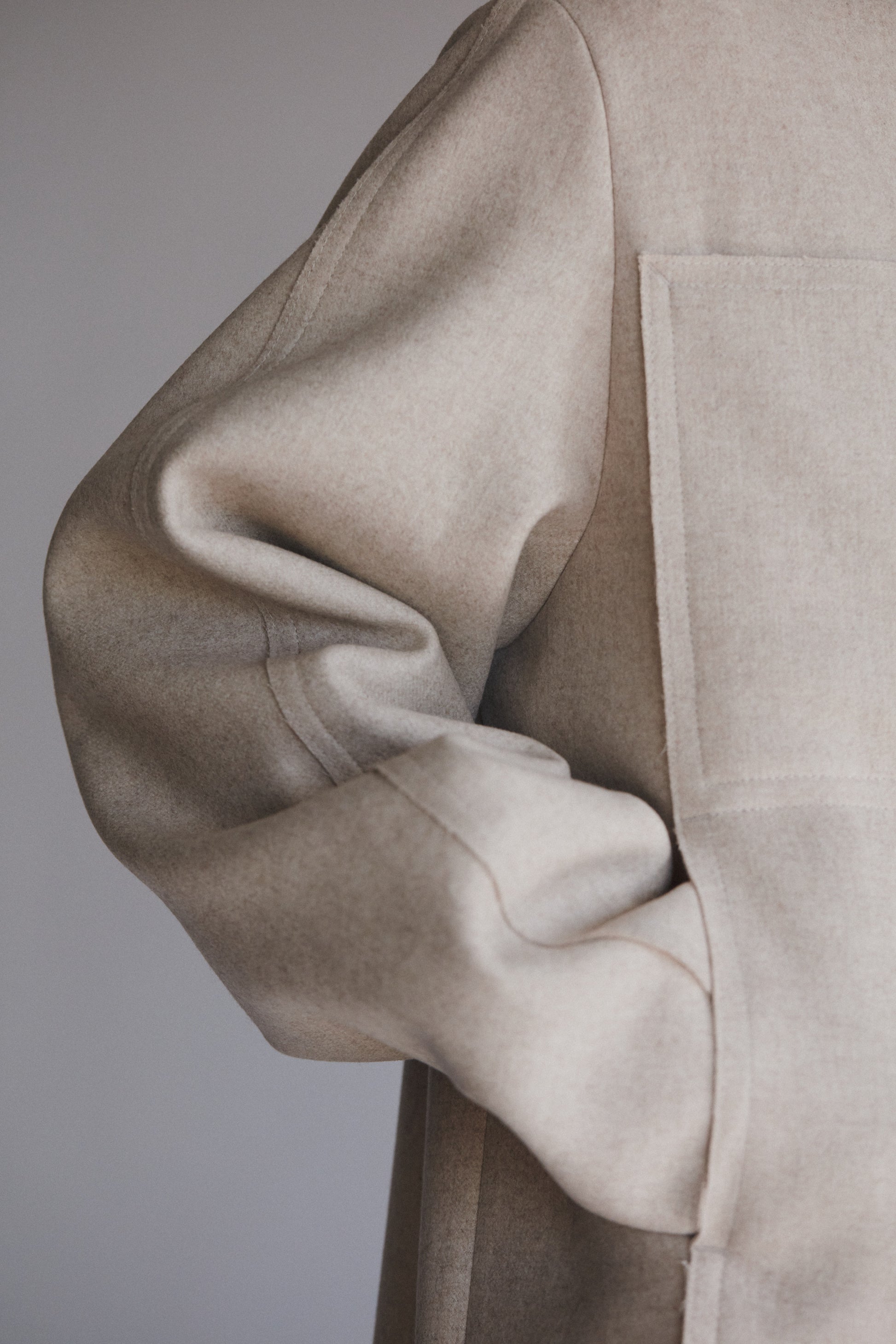 The ultimate cashmere coat that we strongly believe in. Its beautiful, heavyweight construction is a result of slightly boiling the cashmere, which gives a satisfying density and extreme protection against the elements. Features include back strap detailing, asymmetric oversized patch pockets, a button-up front, oversized sculpted sleeves, and raw edge seams. This precious coat comes in one size and truly works on different types of bodies. It is a real shield, allowing one to go out into the world, engage, and make change.