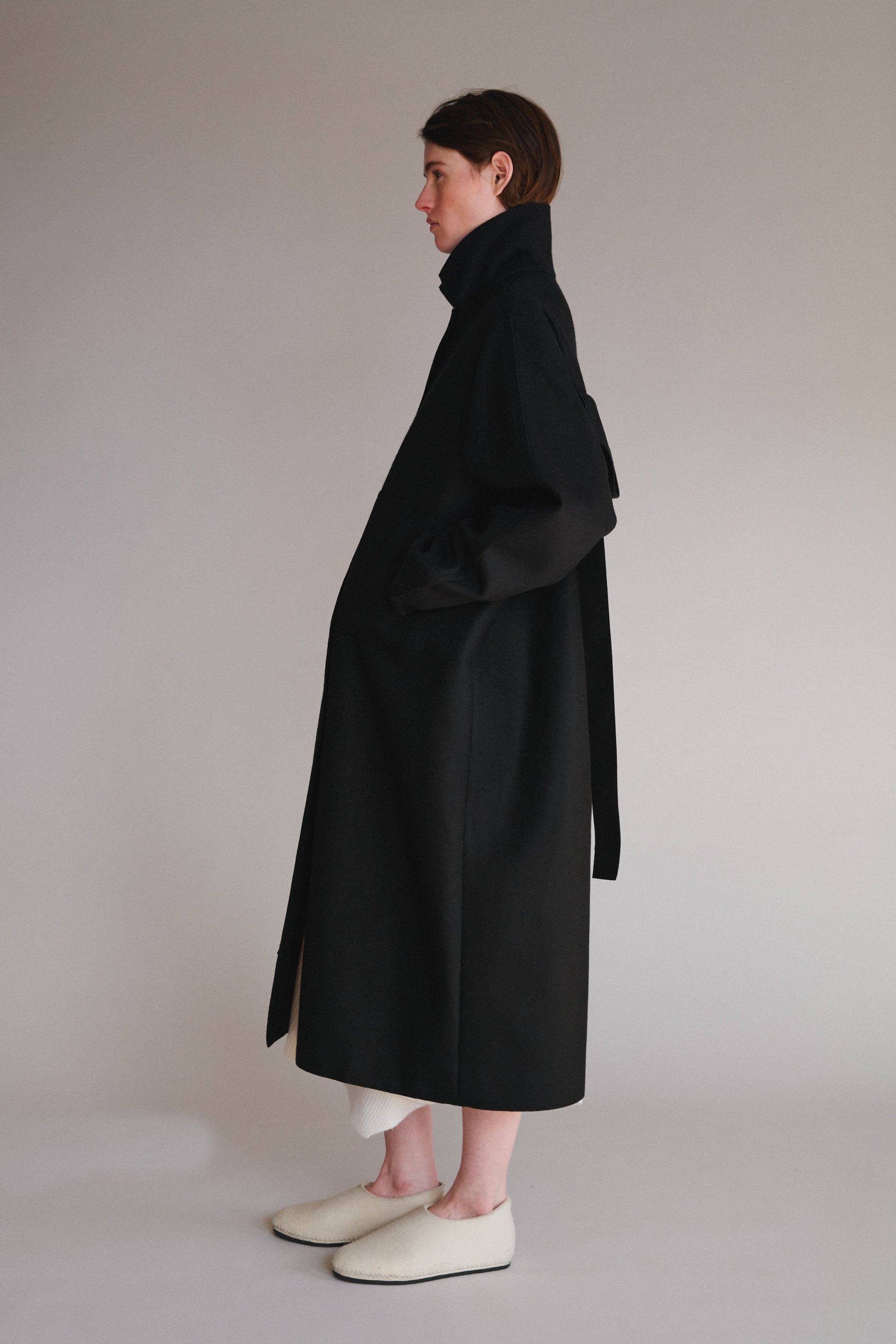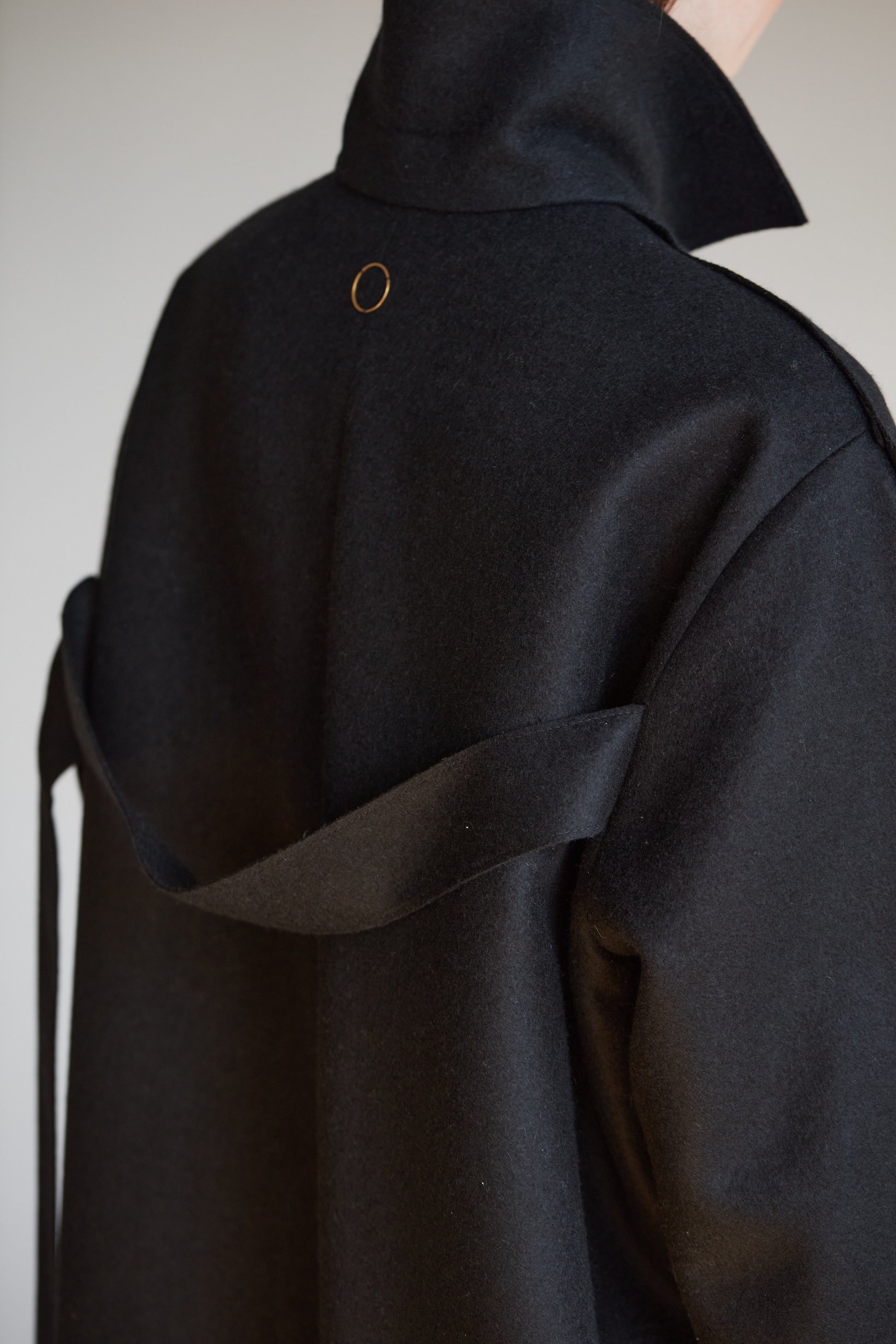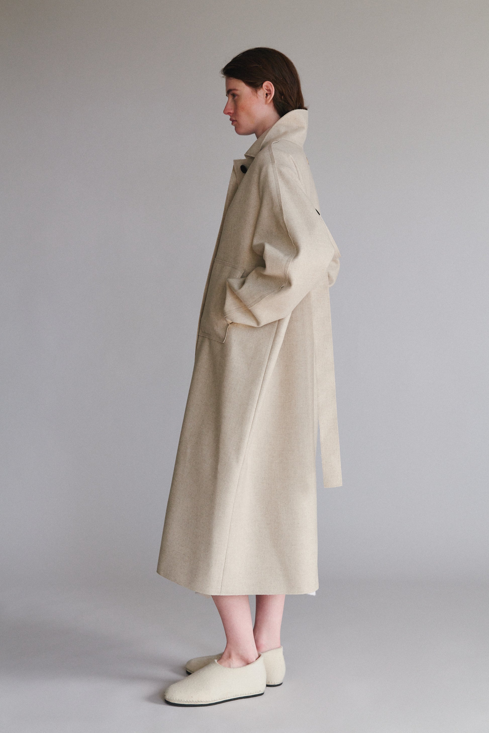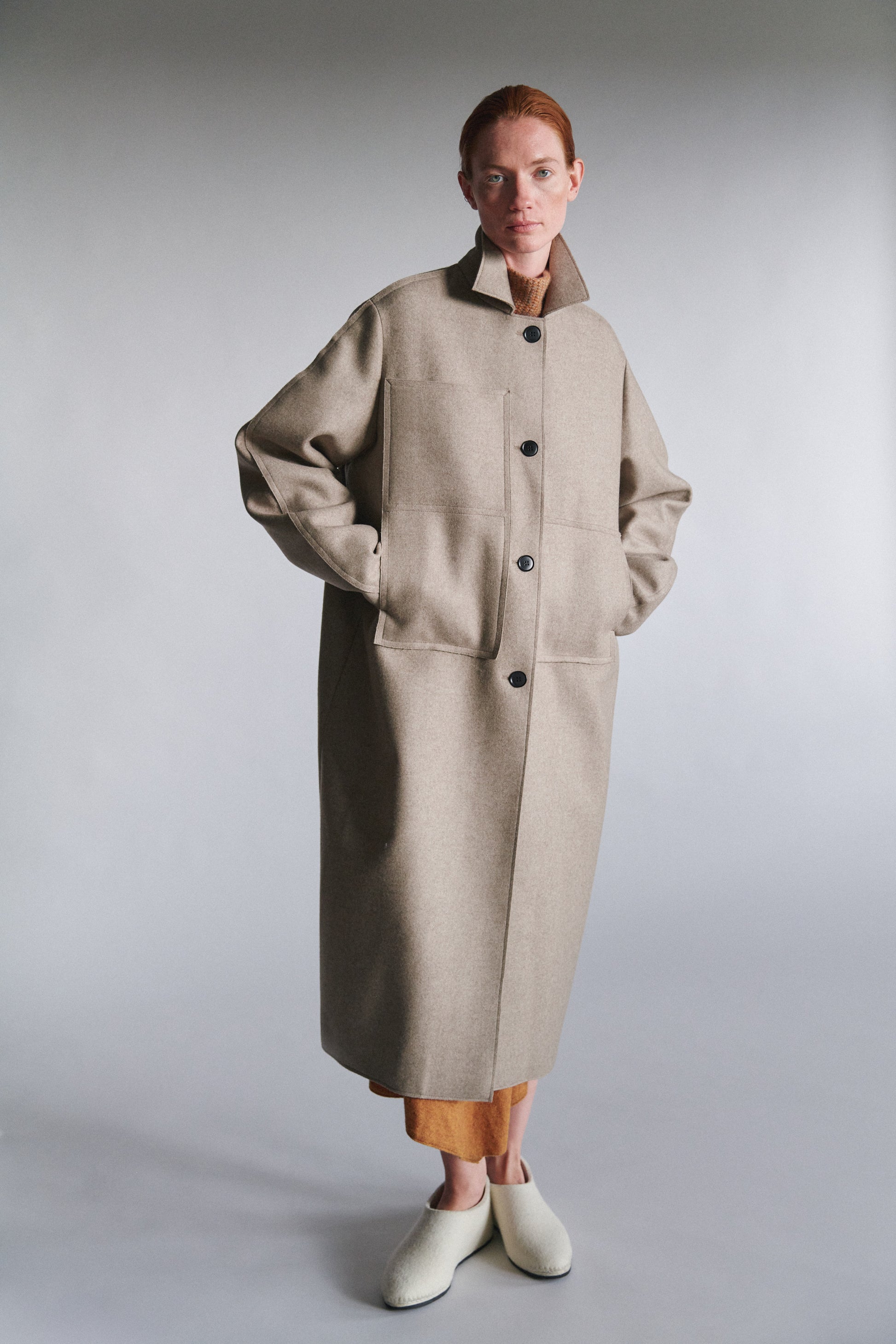 The ultimate cashmere coat that we strongly believe in. Its beautiful, heavyweight construction is a result of slightly boiling the cashmere, which gives a satisfying density and extreme protection against the elements. Features include back strap detailing, asymmetric oversized patch pockets, a button-up front, oversized sculpted sleeves, and raw edge seams. This precious coat comes in one size and truly works on different types of bodies. It is a real shield, allowing one to go out into the world, engage, and make change.