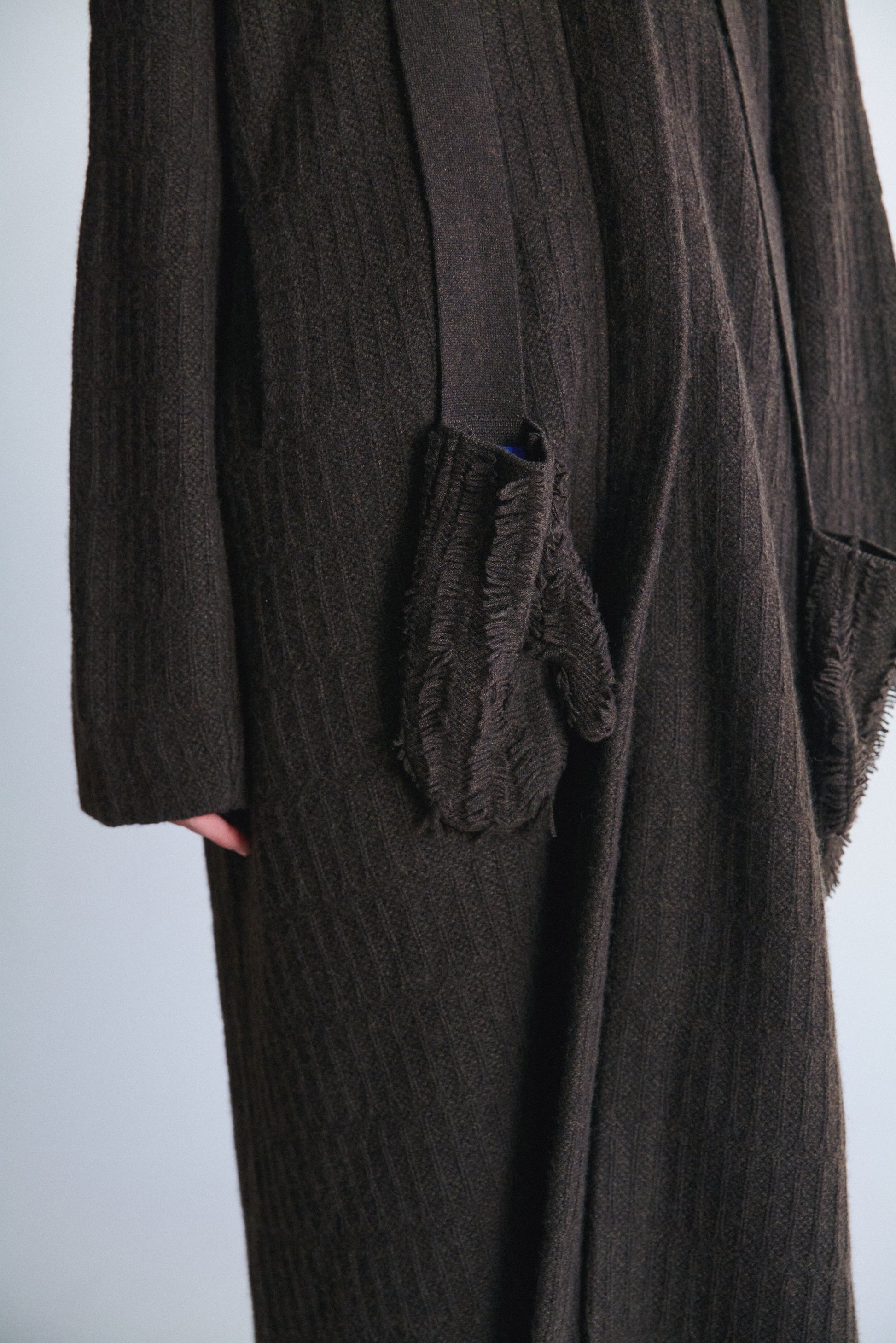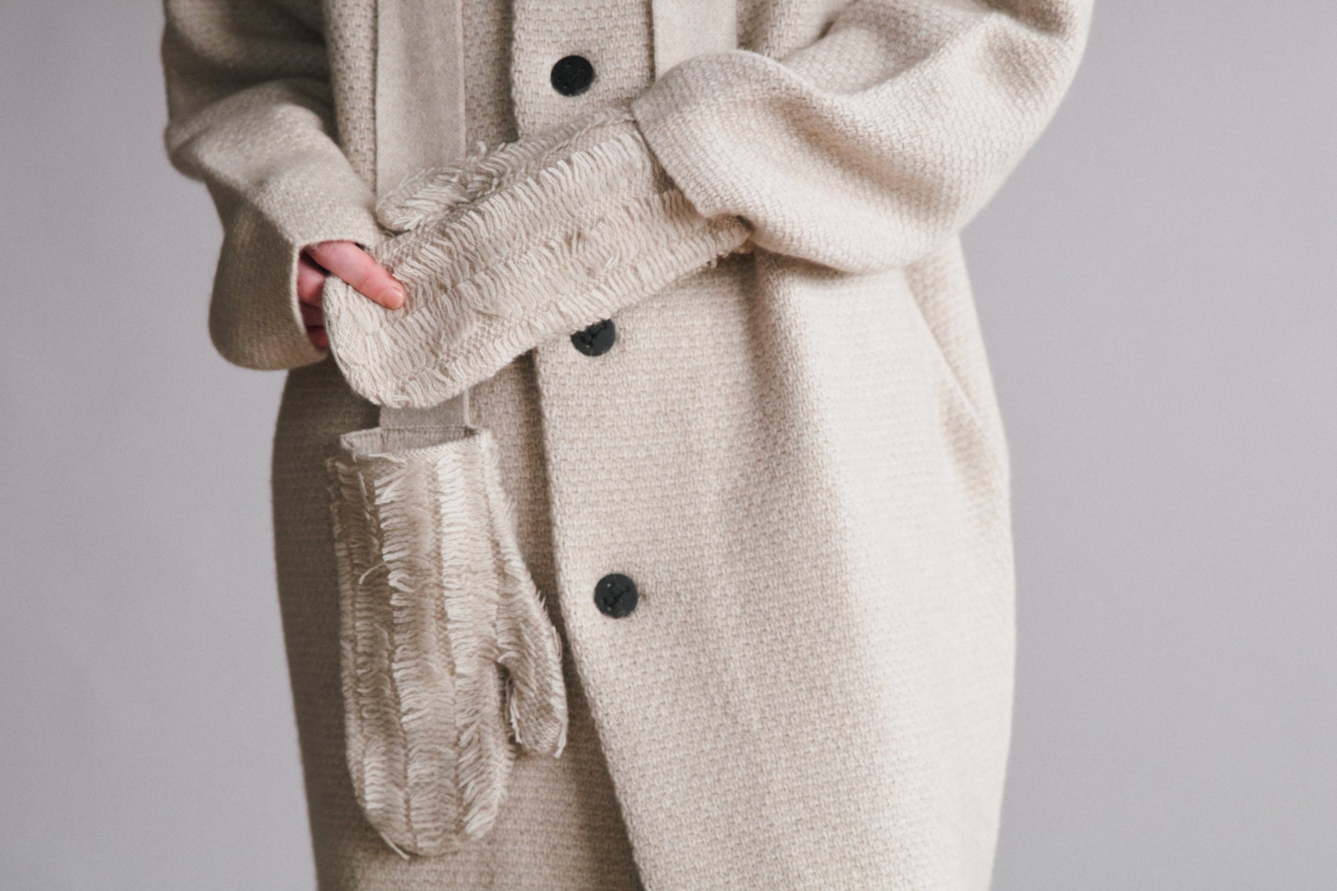 Fun and textured mittens on straps. They offer warmth, texture, and a playful styling element when hanging from under the coat sleeves.