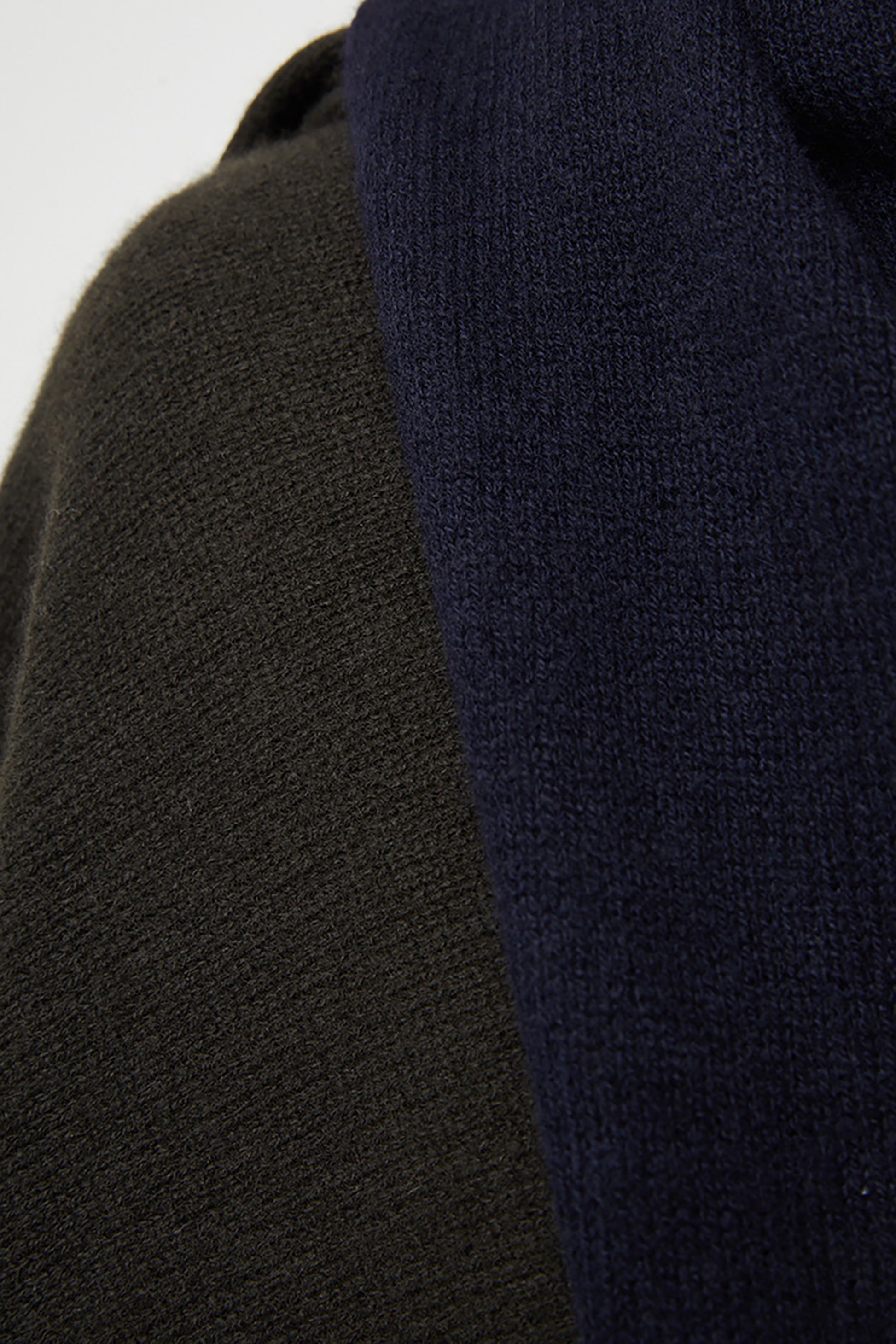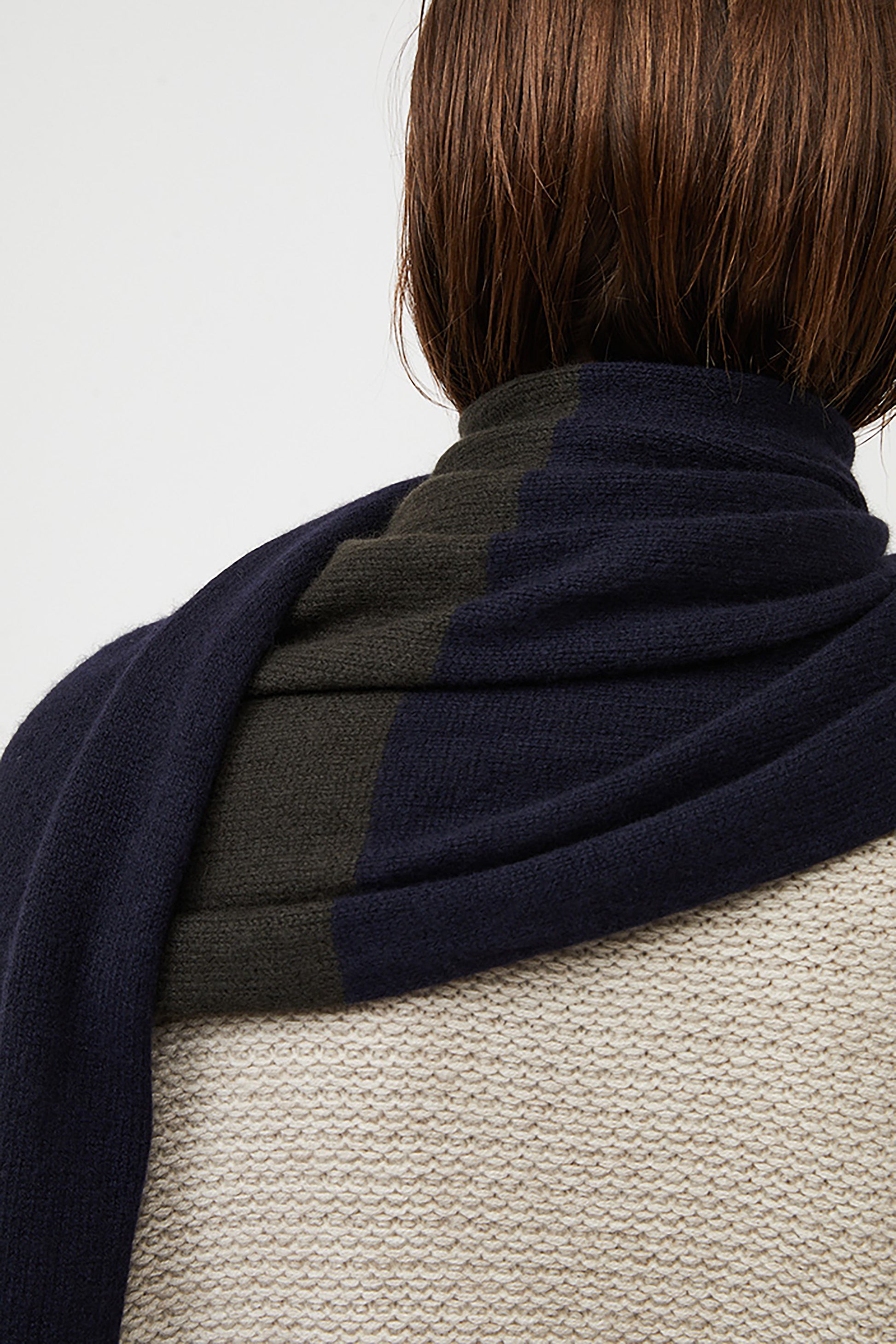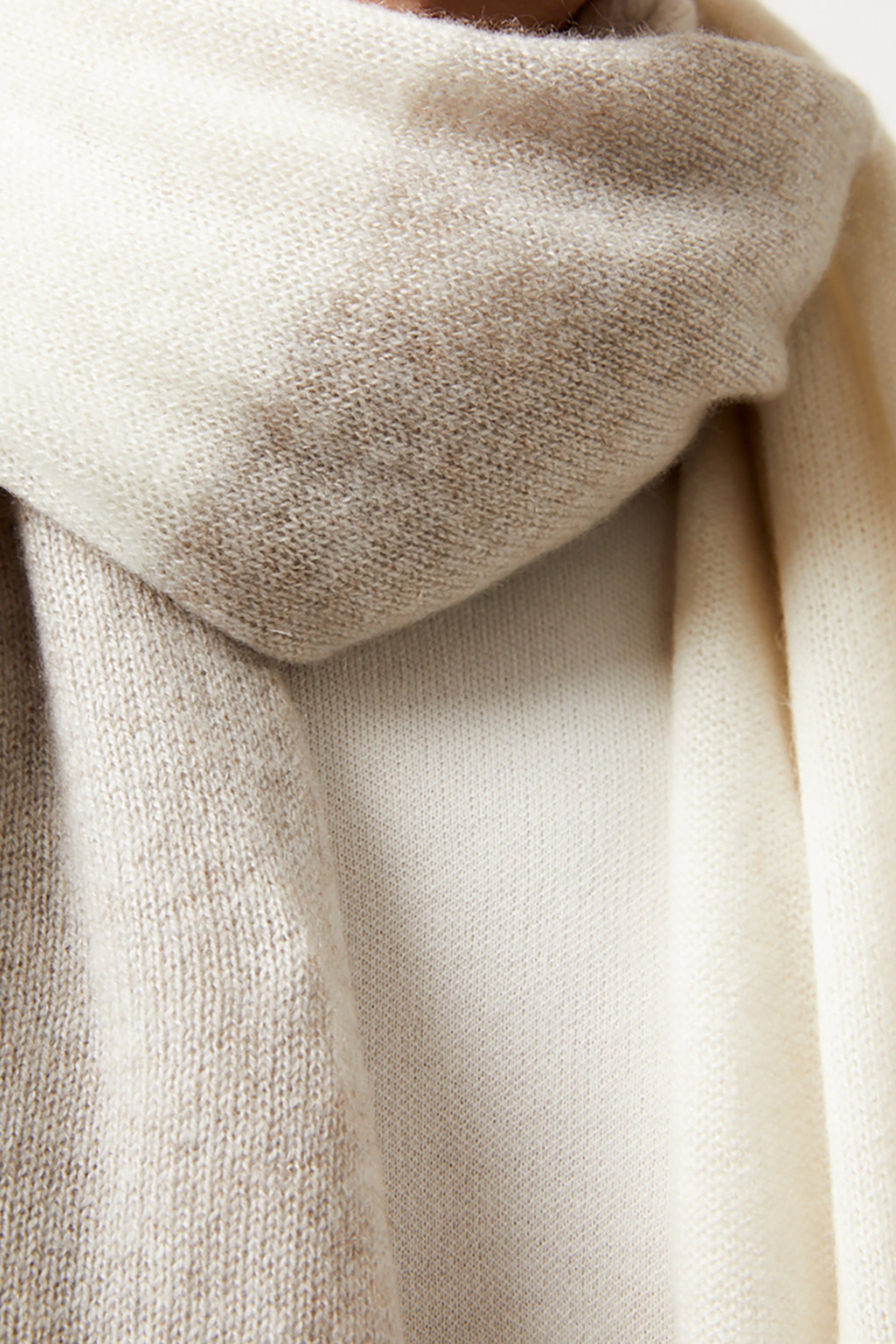 A lightweight knitted shawl with a stepped edge. Half and half coloured, offering versatility for styling with different outfits.