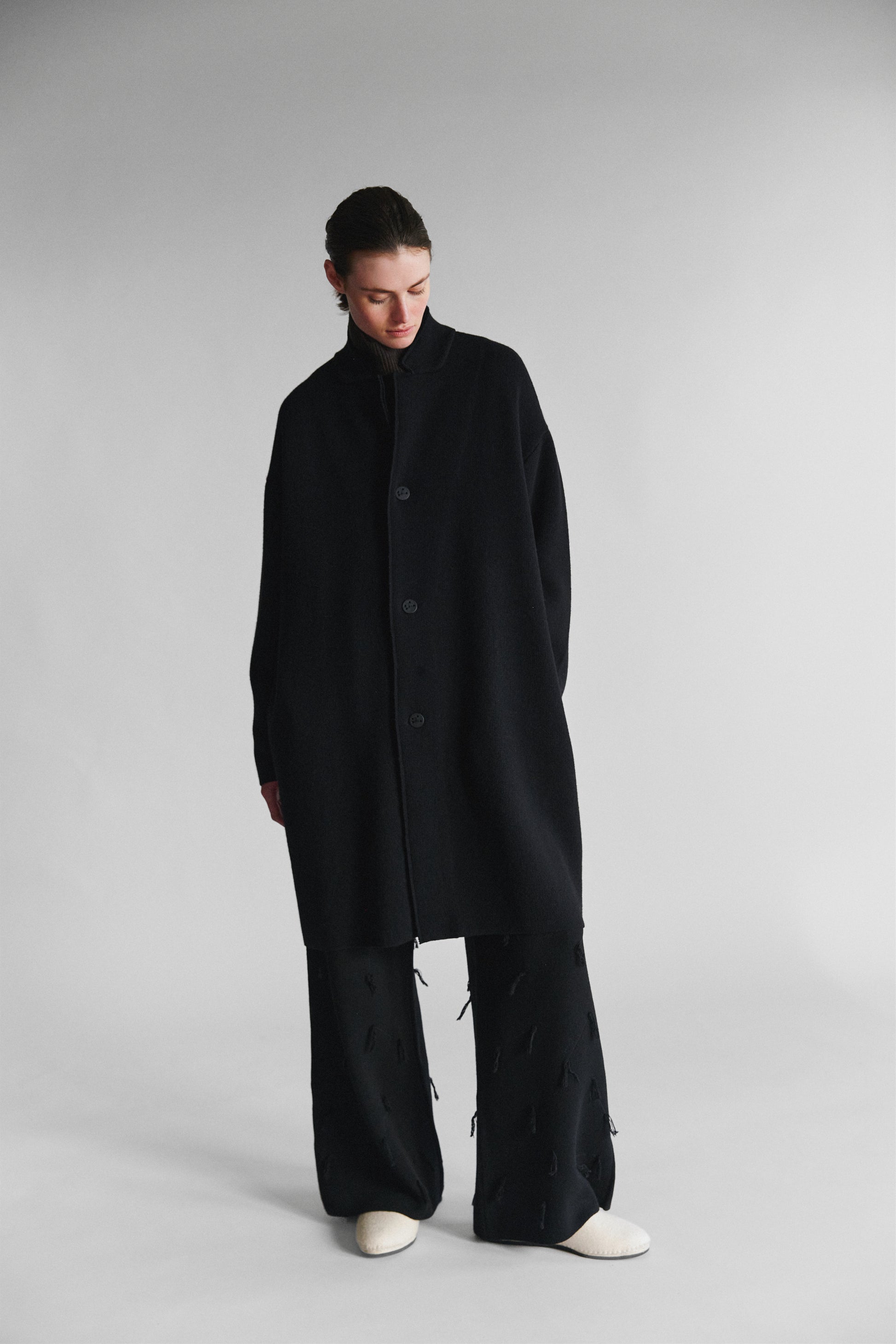 Our core collection coat with an oversized fit and a stand-up collar. This coat features OYUNA signature buttons and welt pockets. Knitted in a structured jacquard knit, it looks like a tailored coat but feels like a soft hug.