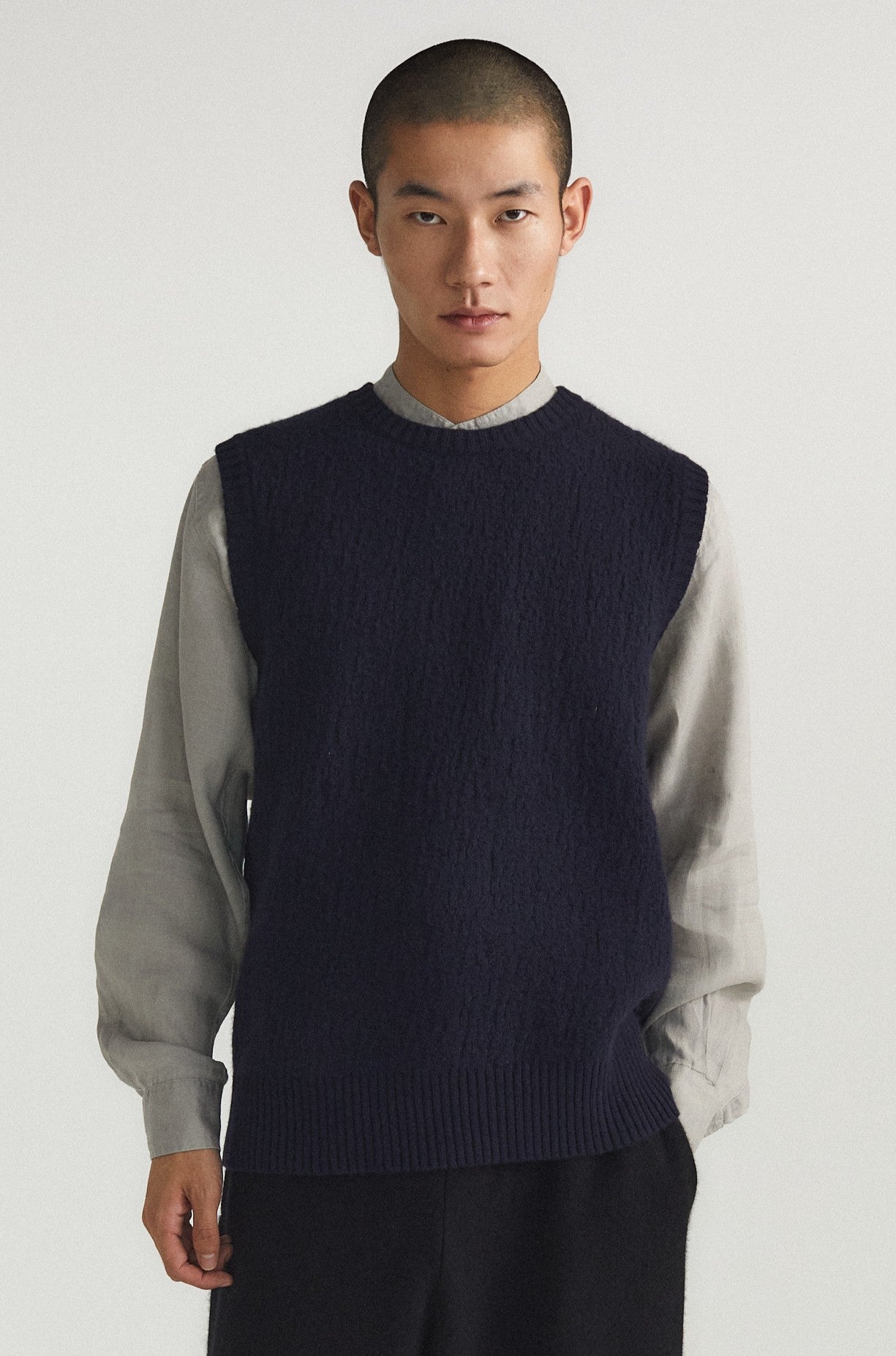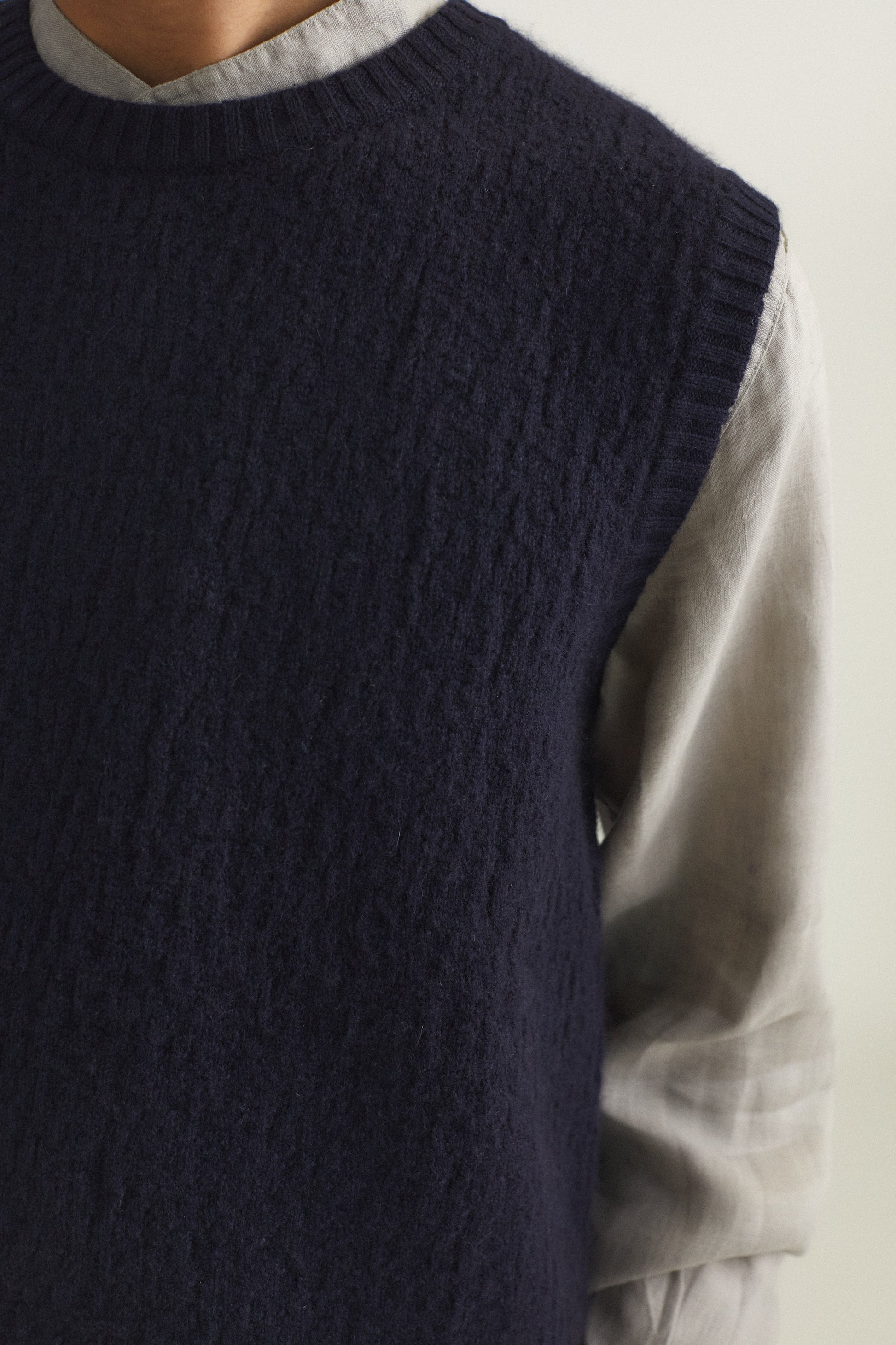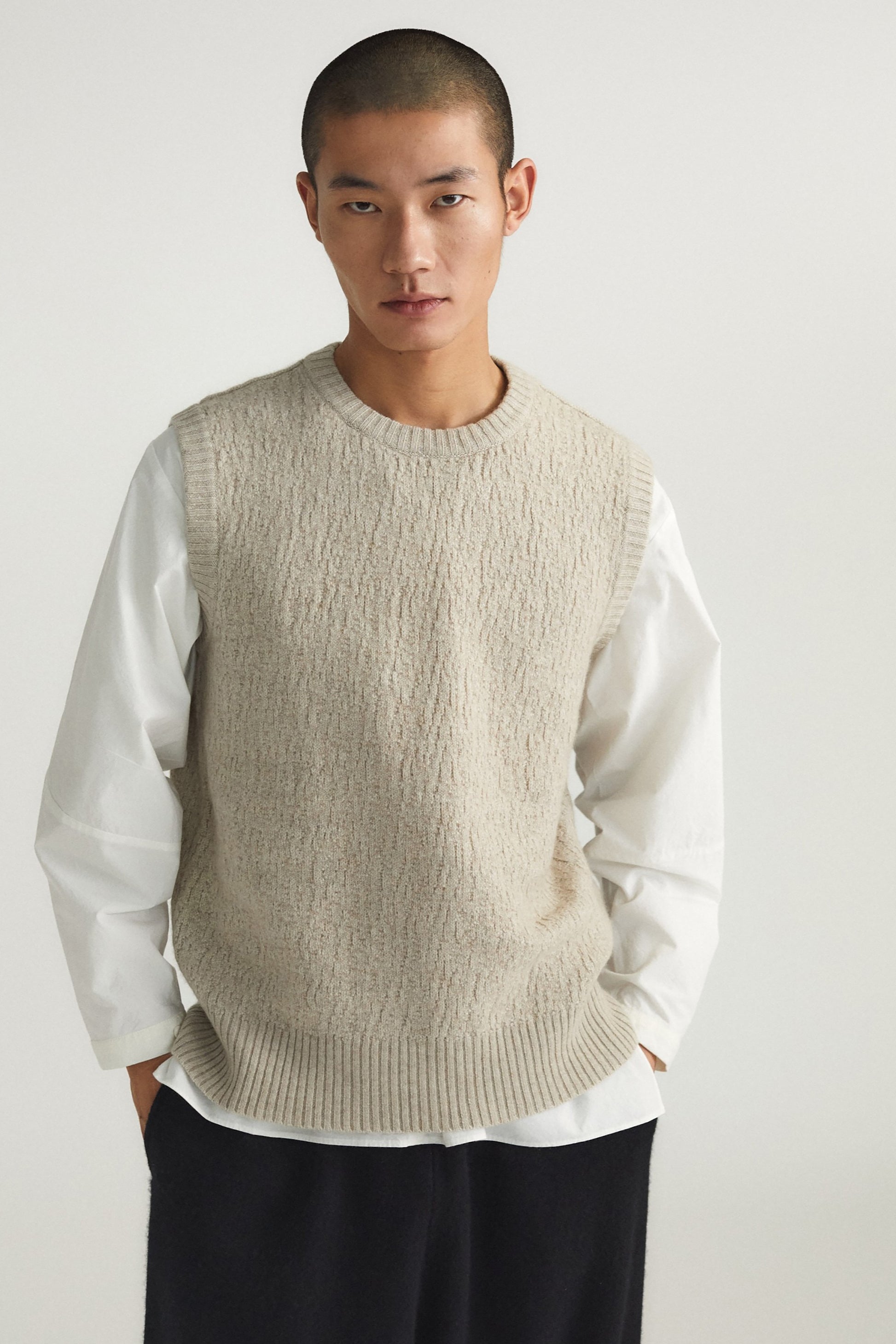 A perfect layering piece with a textured knit, this vest features round rib-knit trims and relaxed-fit armholes. Can be styled with a shirt or long-sleeve top.