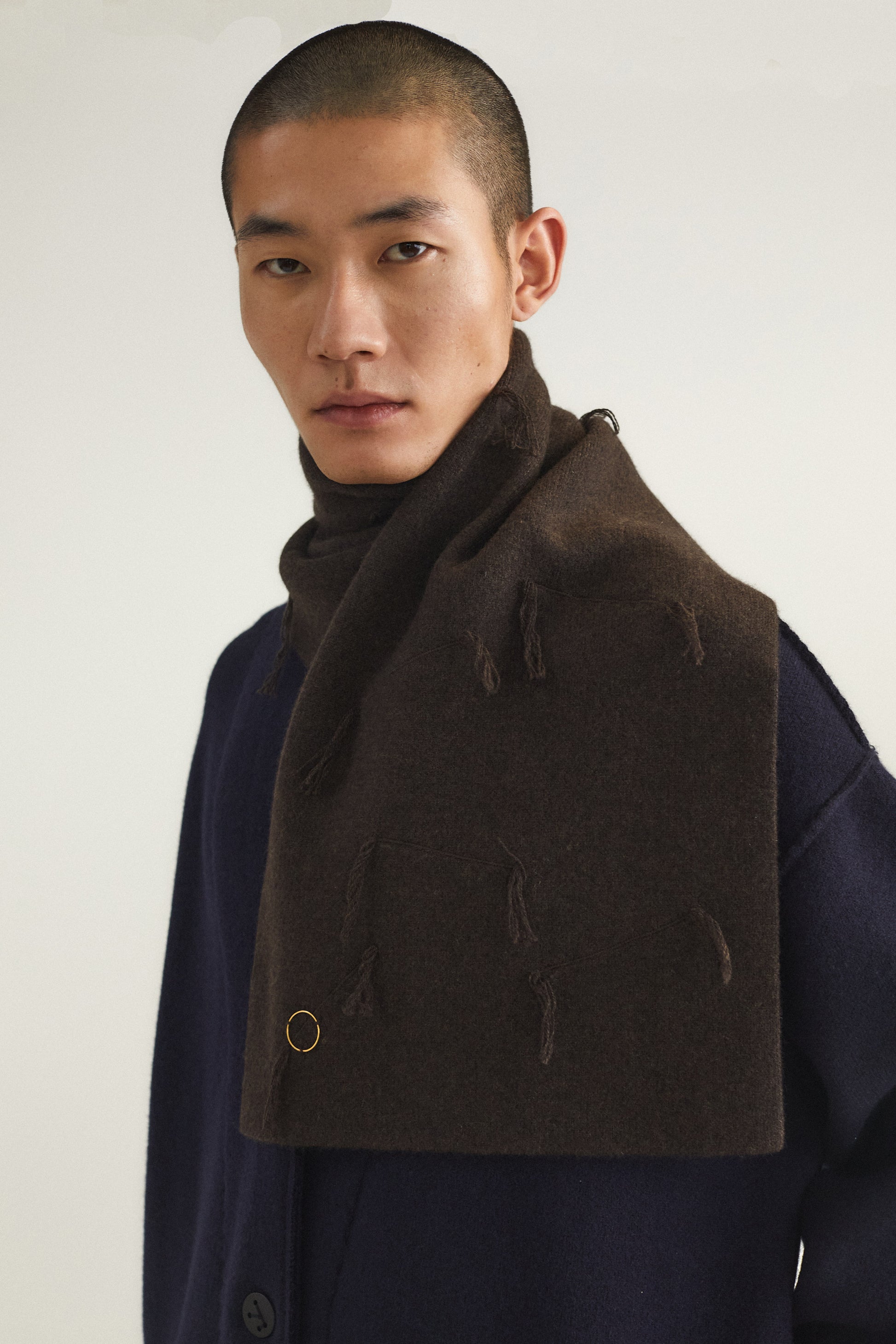 A jacquard-knit neck warmer featuring our signature fringe-textured detailing. It provides both warmth and a distinctive styling element. Perfect for layering, it pairs effortlessly with sweaters, coats, or jackets.