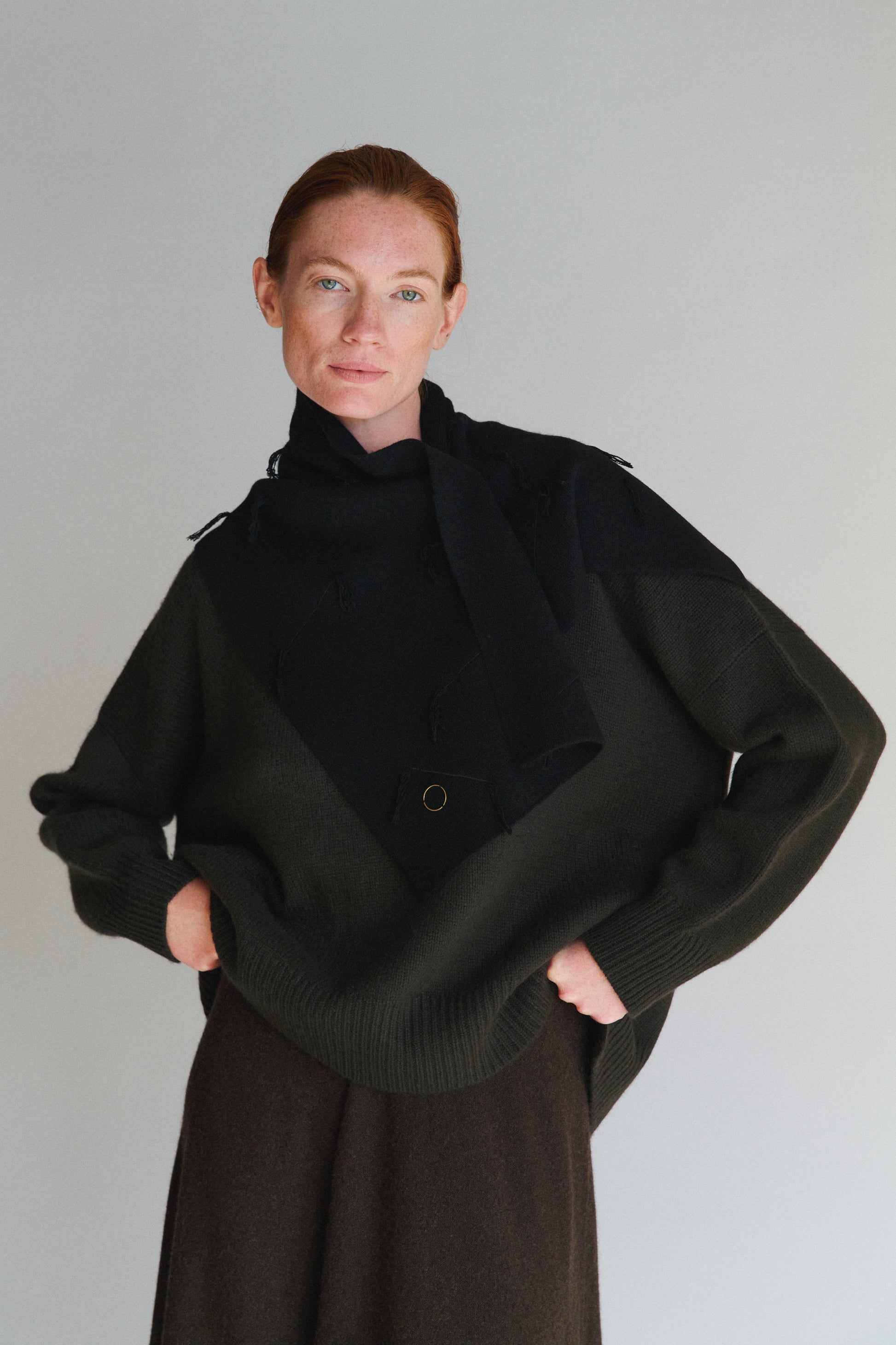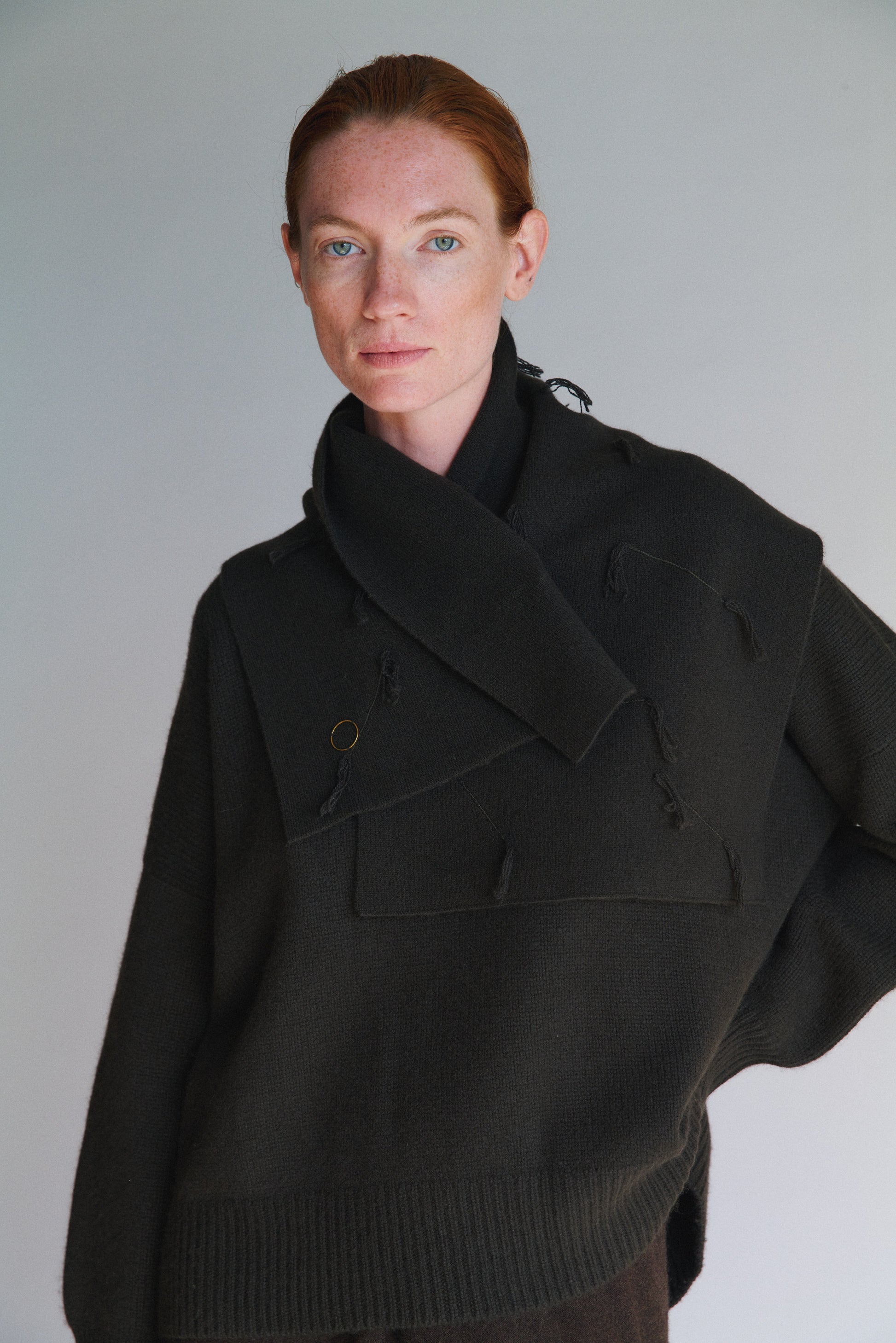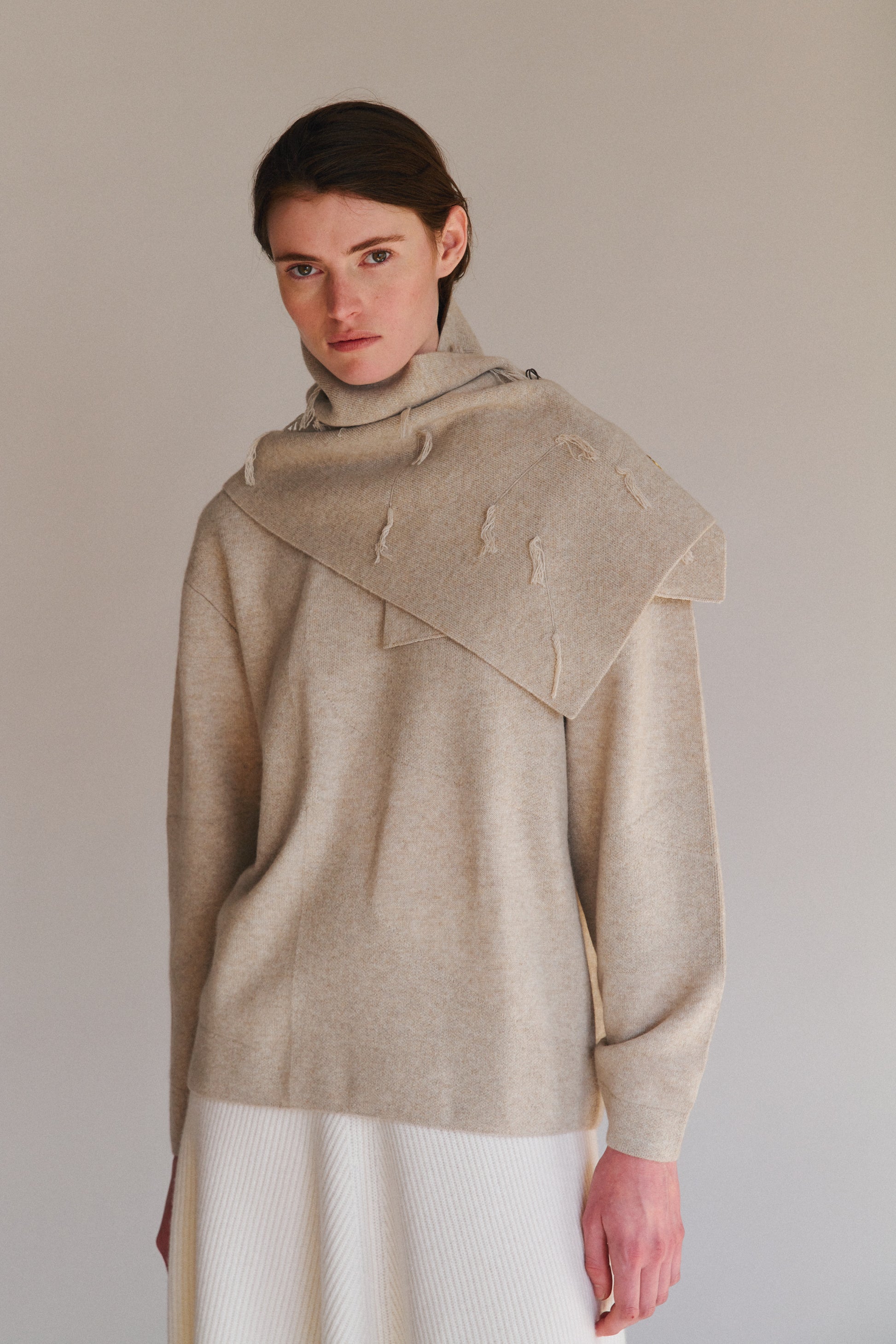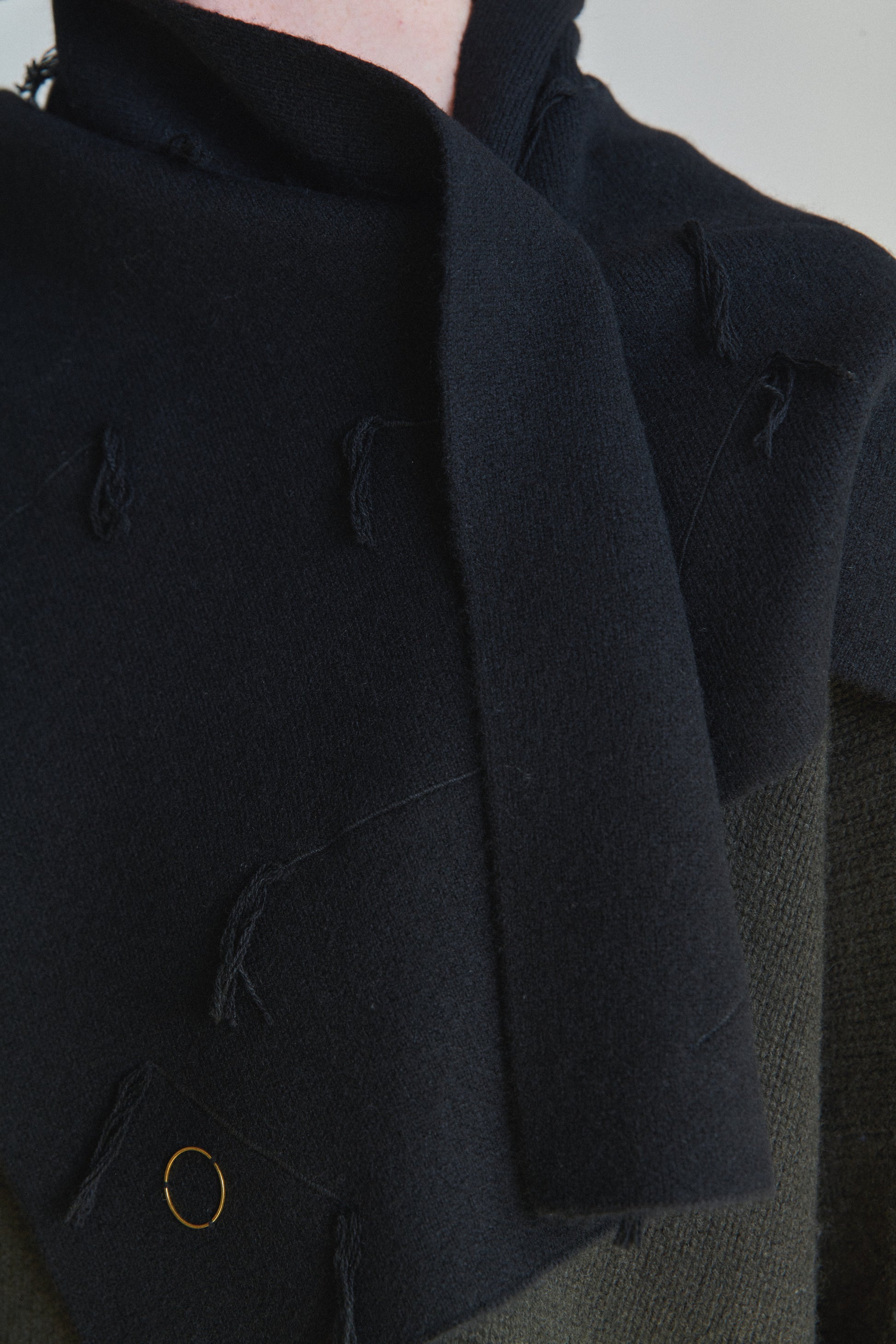 A jacquard-knit neck warmer featuring our signature fringe-textured detailing. It provides both warmth and a distinctive styling element. Perfect for layering, it pairs effortlessly with sweaters, coats, or jackets.