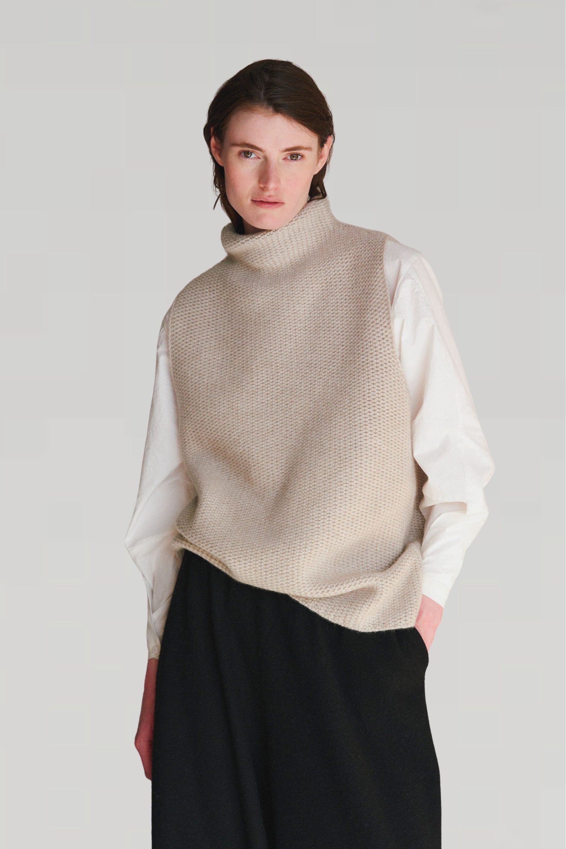 Knitted chunky sleeveless top with rich texture and subtle softness. Perfect for layering, it brings effortless elegance and versatility to any wardrobe. It can be styled over a shirt or vest.