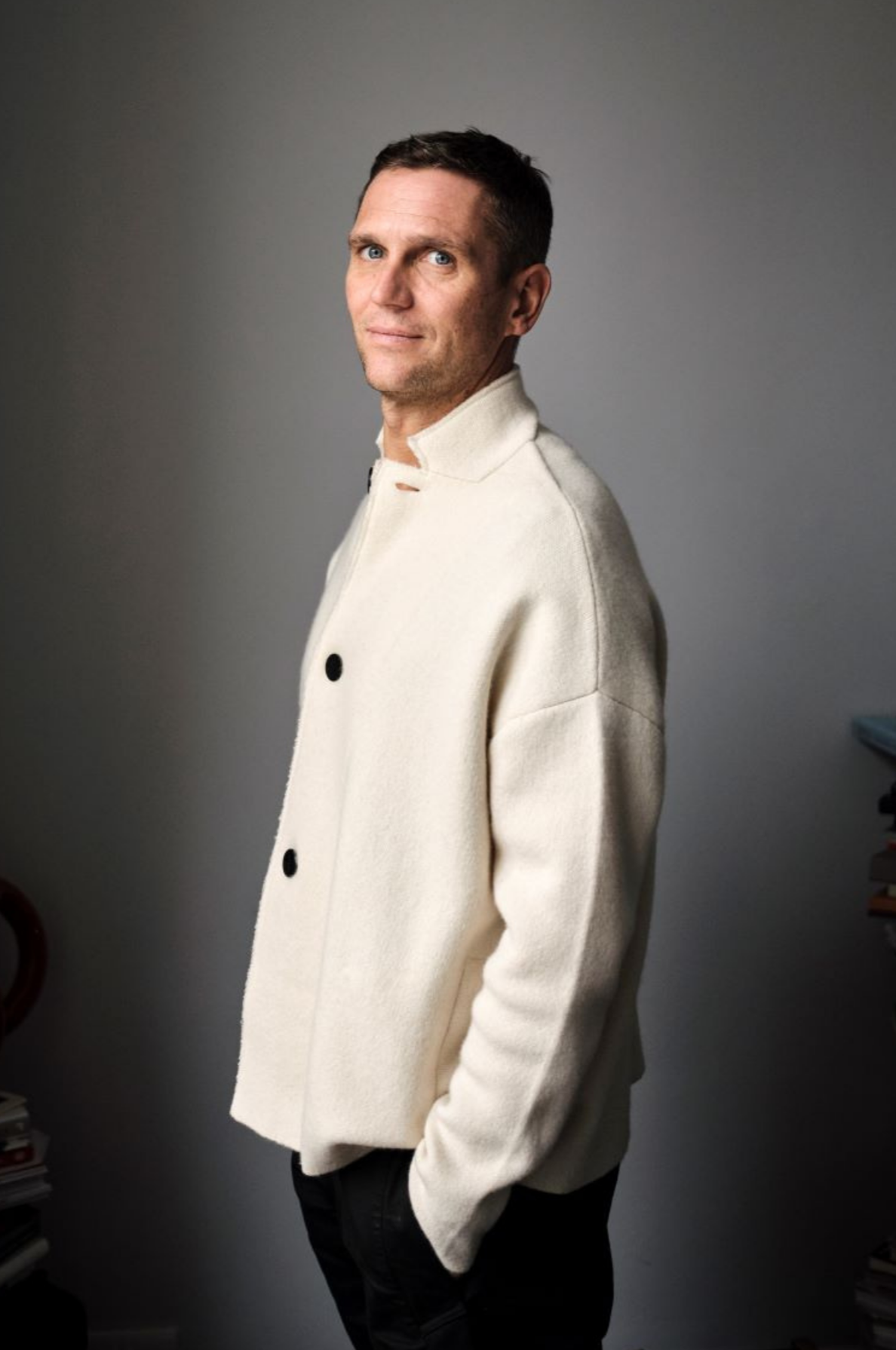 Our core collection relaxed-fit jacket with a stand-up collar, featuring OYUNA signature buttons and welt pockets. Knitted in a structured jacquard stitch, this jacket is a practical yet stylish piece for everyday use and most seasons.