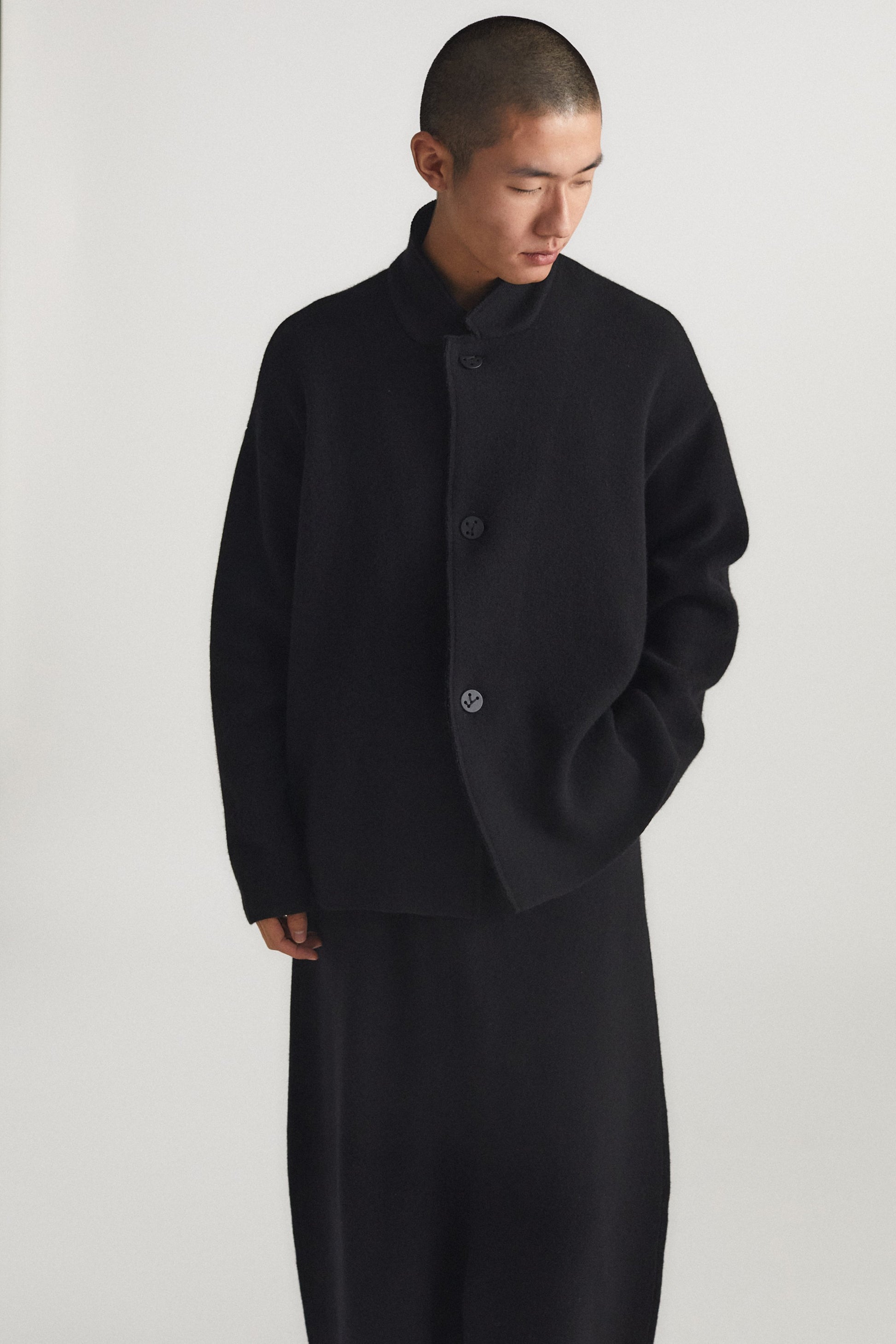 Our core collection relaxed-fit jacket with a stand-up collar, featuring oyuna signature buttons and welt pockets. Knitted in a structured jacquard stitch, this jacket is a practical yet stylish piece for everyday use and most seasons.
